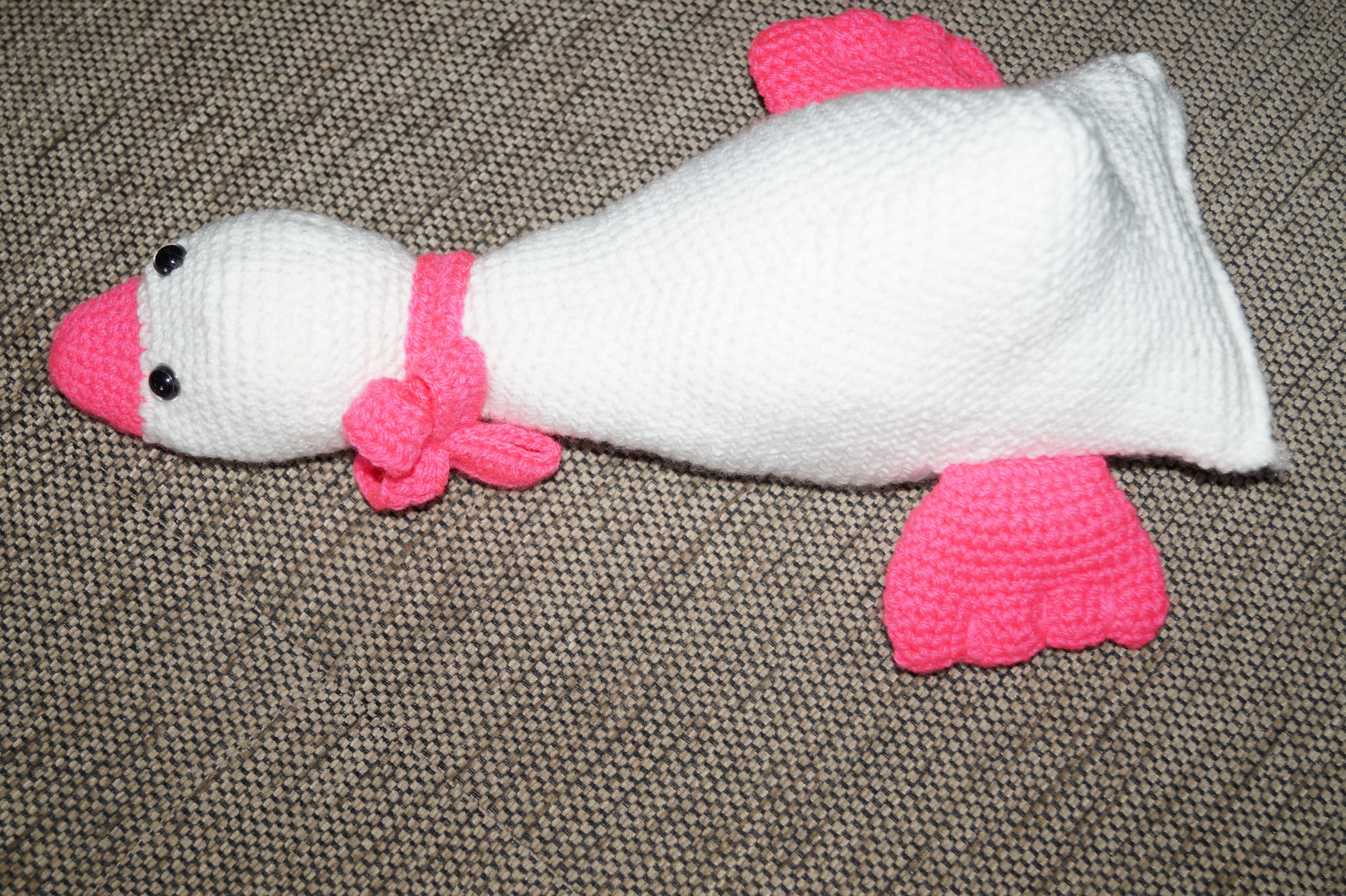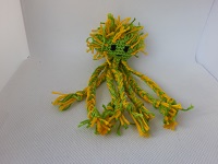 Kuschelhase Hoppel gearbeitet: Wie bei Mauzi besteht der Körper aus Baumwollgarn und Teddywolle und Kopf, Ohren, Pfoten und Schwanz aus feinem Chenille-Samtgarn.