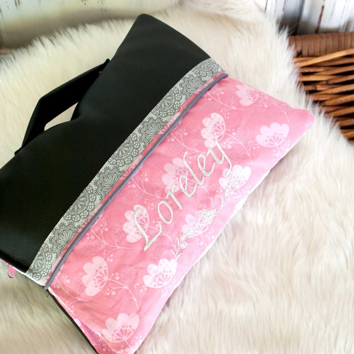 Die perfekte Windeltasche - hier ist Platz für Windeln, Einmalunterlage, Pflege (im Reißverschluss-Fach!), und für Feuchttücher. Die werden mit einem genialen und einzigartigen Entnahme-Fach entnommen ;).