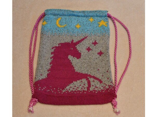 Dieser glitzernde Turnbeutel "Life is magic" ist ein ganz besonderes Geschenk für jeden Einhornfan 😀 Er wird in Doubleface gestrickt (mit Glitzerfaden), nur der Boden wird in festen Maschen gehäkelt. Die Anleitung ist sehr ausführlich beschrieben und bebildert, so dass jeder, der Doubleface stricken kann, dieses Kunstwerk gut schafft.
