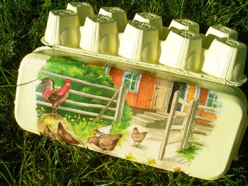 da wir 5 Hühner haben, die auch schöne bunte Eier (braune, weiße, grüne) legen und wir diese manchmal verschenken, habe ich vor Jahren mal Eierkartons mit Serviettenmotiven verziert. Das war mal nur so aus Spaß, weil mir das Serviettenmotiv so gut gefiel und passend erschien. Den Karton habe ich vorher mit hellgelber Acrylfarbe gestrichen, damit das Motiv besser rauskommt.