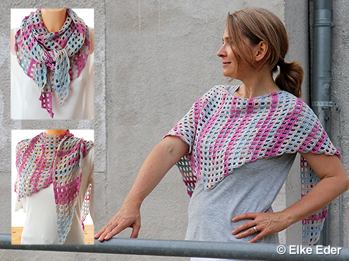 Es wird von der Seite aus gehäkelt und ist symmetrisch. Es ist schmäler als die bekannten Dreieckstücher, dadurch vielseitig einsetzbar: z. B. als Schal, Tuch, Hüfttuch, schnell gewickeltes Top, Loop etc.