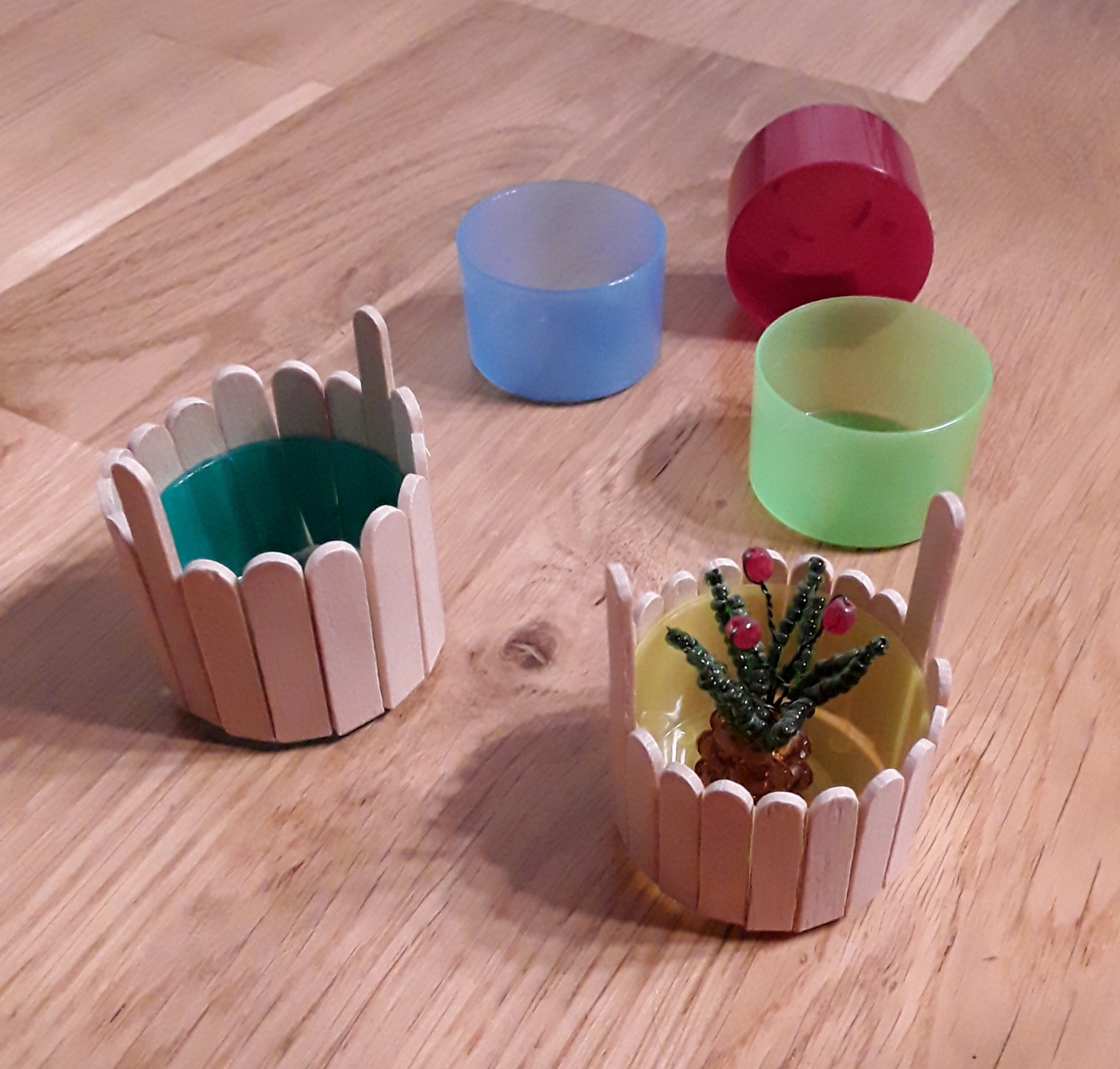 In diese bunten Plasteteile war urspruenglich ein Teelicht. Zum Wegwerfen waren sie mir zu schade, da habe ich sie mit kleinen Eisstielen umklebt. Man kann sie als kleine Blumentoepfe verwenden oder einen kleinen Brunnen basteln mit einem Drahtbuegel drueber. Die laenglichen Teile bekommen ein Loch gebohrt, dann kann man sie aufhaengen. Oder man nimmt das Original Teelicht, oder ein elektrisches, das passt aber nicht ganz rein.