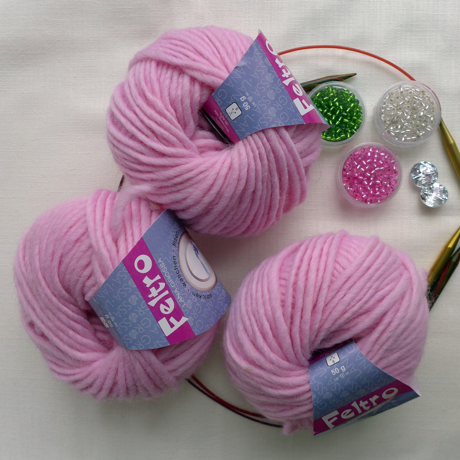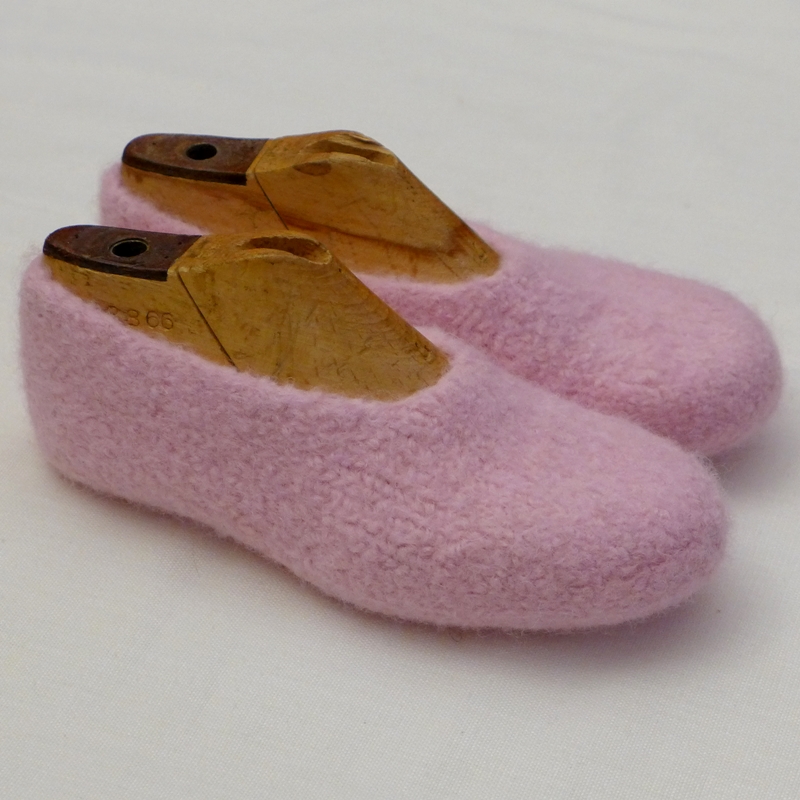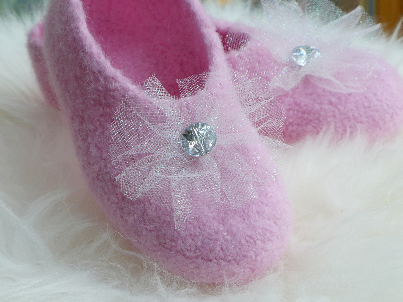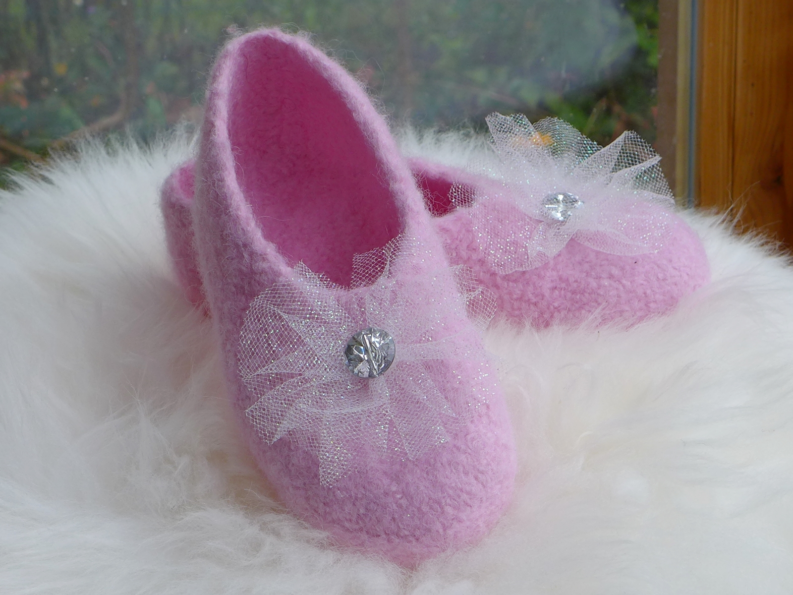 Ich habe mittlerweile die Rosa Filzies fertig. Naja, eigentlich wollte ich Perlen aufnähen, aber dann fiel mir ein Stück Glitzertüll, was ich von meinen Ballkleidern übrig hatte, in die Hände. Und so habe ich einfach nur oben auf jeden Schuh eine Tüllblüte mit Glitzerstein genäht. Jetzt muss ich noch die Sohlen gummieren.