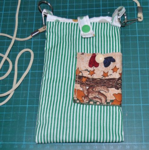 hab wiedermal einige Stoffreste verarbeitet und mir ein Händytäschle zum umhängen genäht. Hinter dem teddybild vorne verbirgt sich eine kleine tasche, in der ich mein Athmanotfallspray versteckt hab. Der kleine Teddy war ein Geschenk meines mannes als ich die erste Wirbelsäulenop über mich ergehen lassen musste, seitdem begleitet mich der Schutzengelteddy überall mit hin. Ein kleines Chiptäschle noch mit hingemacht, so hab ich immer einen parat und muss ned lange suchen. Als Band hab ich einen langen Schnürsenkel genommen, passt:-)