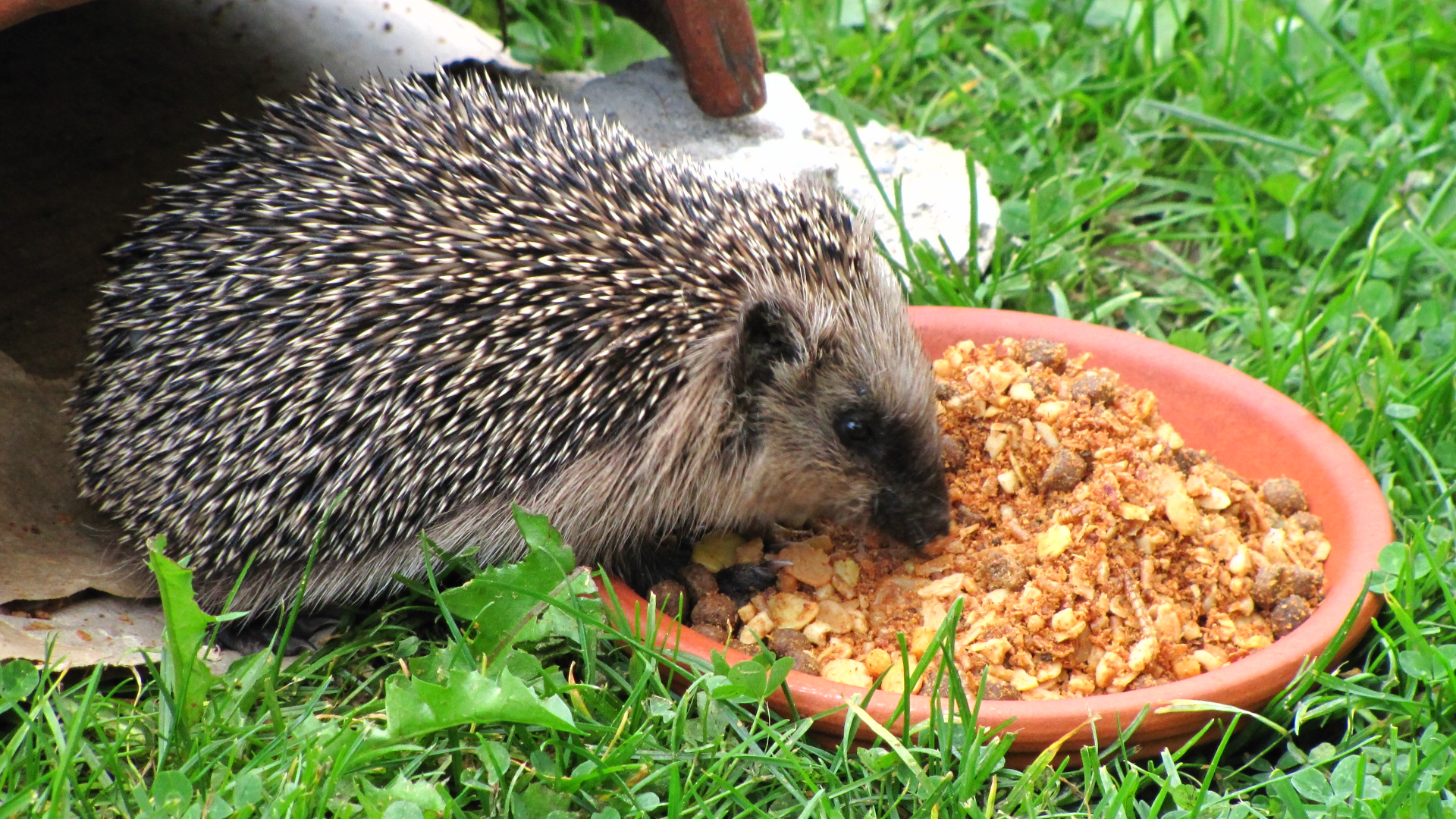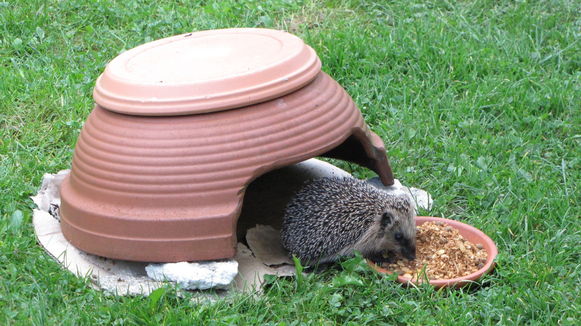 Leider sind wir im Umkreis wohl die einzigen, die einen Garten haben, der für Igel zum Schlafen geeignet ist. Rundherum sind sie alle ordentlich und wirken ziemlich leer. Da gibt es keine kuscheligen Ecken zum Schlafen.