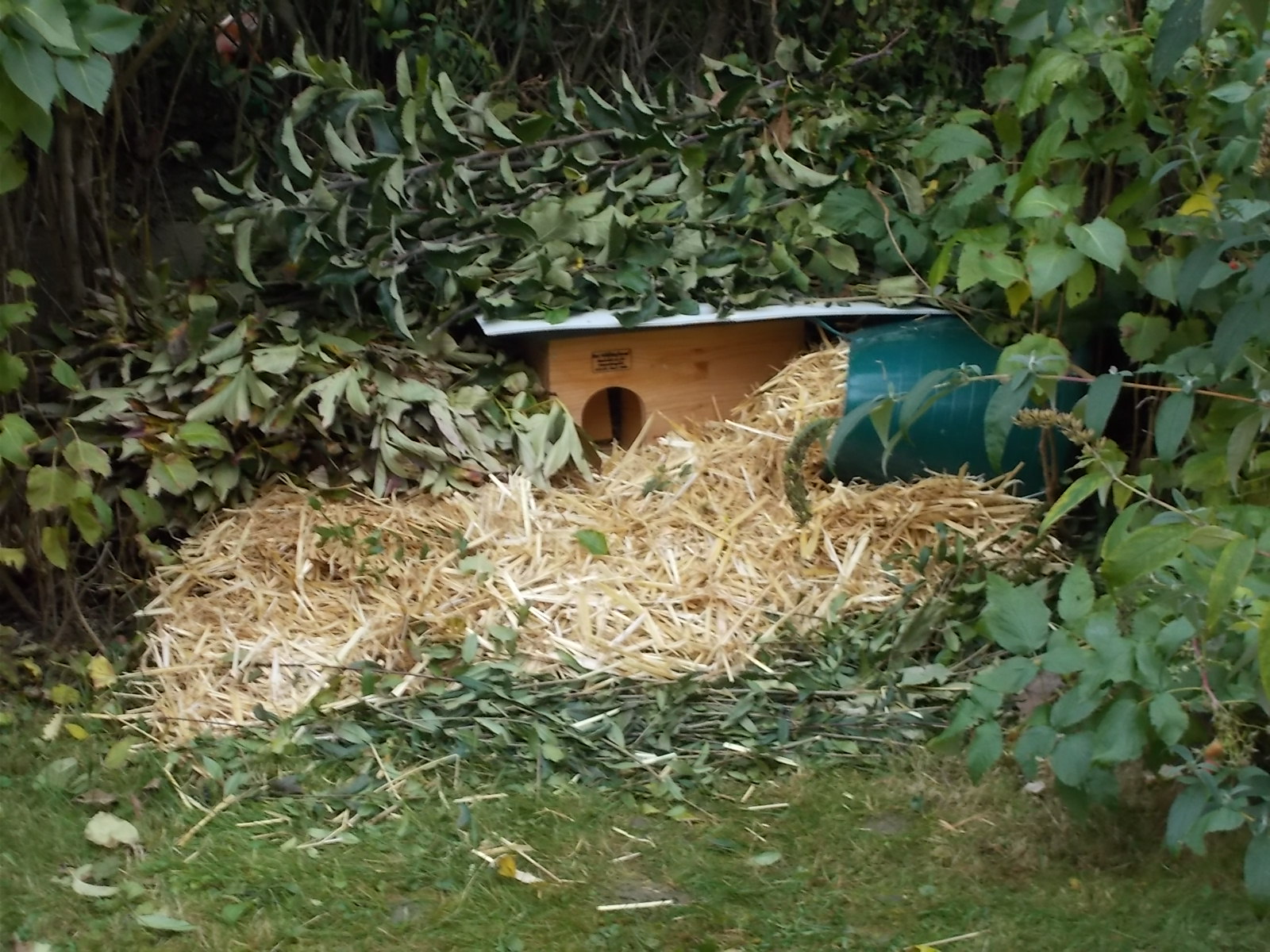 Nun haben wir unseren Igeln ein Winterquartier der Luxusklasse bereitet. Dafür haben wir von einem Bauern etwas Stroh besorgt und unser Igelhaus dazu gestellt. Da haben sie jetzt die Auswahl, was ihnen am besten gefällt. Im November kommen dann noch Blätter und Zweige da drauf.
