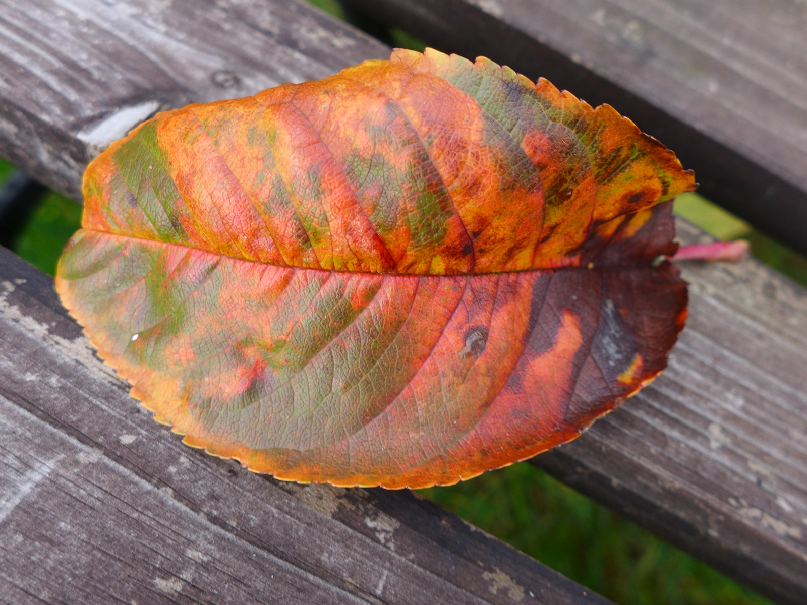 Als ich neulich in meinem Garten meine Dehnungsübungen machte und nach unten gebeugt stand, fiel mein Blick auf ein Kirschbaumblatt zu meinen Füßen. Das war so schön, dass ich meine Übungen unterbrach, um es zu fotografieren. Ist die Natur nicht großartig, dass sie solche Farben und ein solches Farbspiel in nur einem einzigen Blatt hervorbringt? Was müssen wir Menschen uns anstrengen, um annähernd Ähnliches künstlich zu erschaffen.