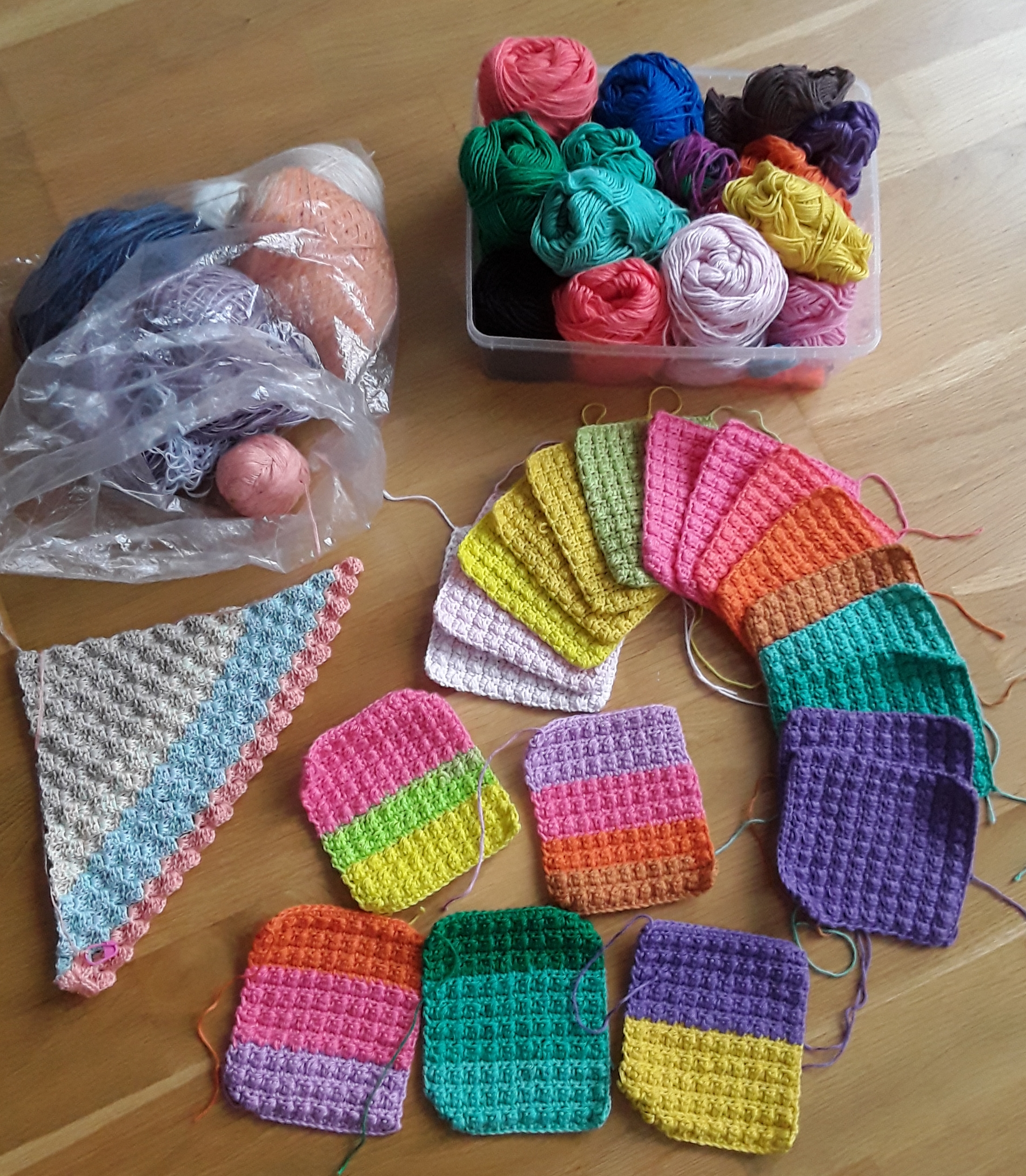 Ich bin am Wollreste abbauen. Habe noch einige Quadrate gehaekelt.