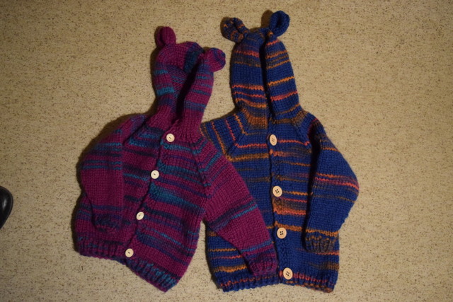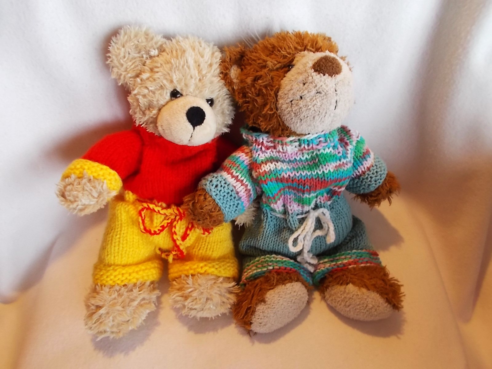 Der grün-bunte Teddy-Overall gefällt mir sehr gut. Besonders das bunte Oberteil gibt ihm mehr Frische. Man schaut interessierter hin, weil das Farbspiel den Blick anzieht. Vielen Dank, dass Du uns das bezaubernde Foto der beiden Teddys mit ihrer neuen Garderobe gezeigt hast. Ganz stolz sitzen sie nebeneinander und zeigen, was sie Neues von der "Bärenmutti" bekommen haben. Ich finde, dass Du die Farben den Bären auch gut zugeordnet hast. Dem braunen Bären steht der grün-bunte Anzug besser und dem blonden der rot-gelbe.