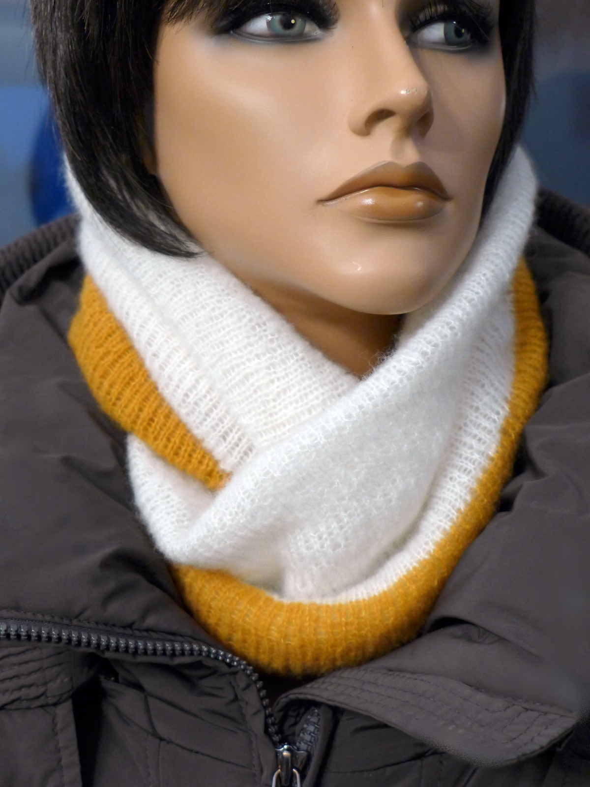 Für meinen Lila-Loop habe ich 3 Knäule á 25 g verstrickt. Vermutlich hätten auch 2 genügt, aber ich wollte ihn ja für draußen und für den Winter. Wäre er überwiegend für drinnen oder die Übergangsjahreszeit gewesen, hätte ich ihn mit 2 Knäuelen gestrickt. Gestern hat er mir gute Dienste geleistet, weil ich 30 Minuten im kalten Wind auf dem Bahnsteig auf meinen Zug warten musste. Ich habe meinen Kopf richtig reingekuschelt und auch bewundernde Blicke anderer Frauen registriert. Das Lila fällt schon auf, aber mir gefällt es so.
