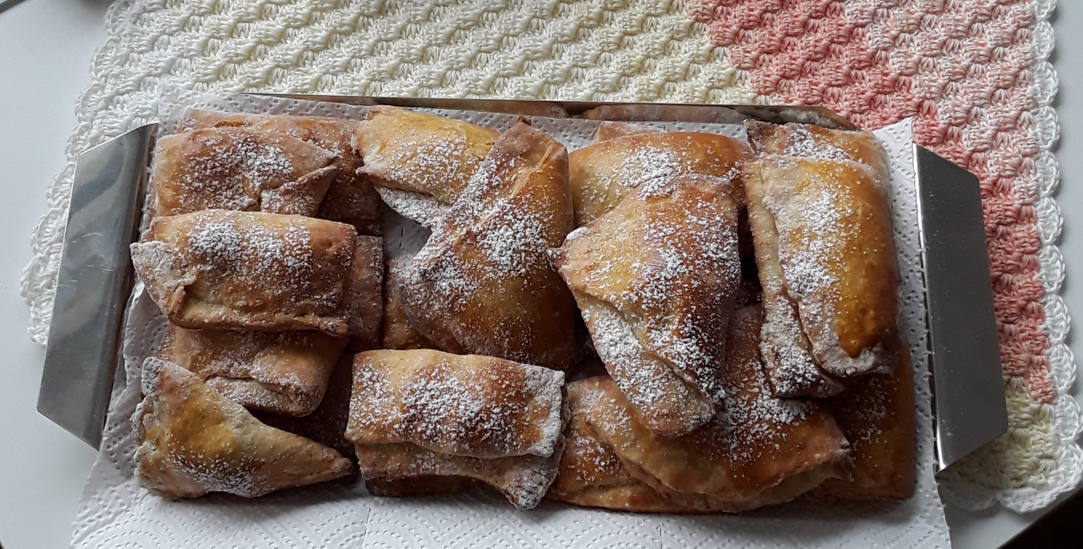Mir war heute mal so nach Apfeltaschen backen mit diesem Quark-Hefeteig. Teils ist auch mit Marmelade gefuellt, weil ich nur noch 1 Apfel hatte. Geht schnell, und man hat was Leckeres zum Kaffee.