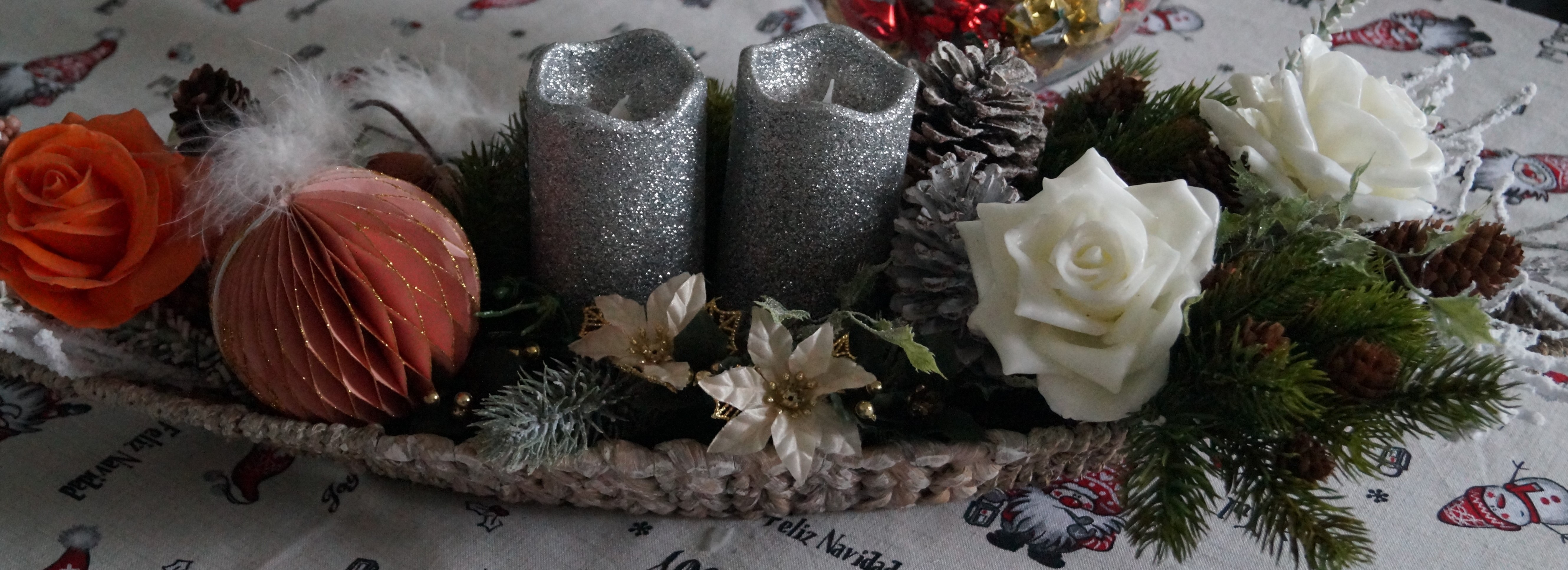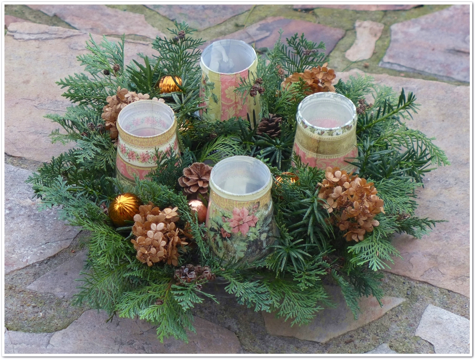 Ich beginne dann auch gleich mit meinem: Mir war irgendwie nach einem ganz natürlichen, zurückhaltenden, ruhigen oder viel Bling bling. Also habe ich 2 Sorten Nadelgrün im Garten geschnitten und in mein Velou-Stecksystem gesteckt. Da kommt unten Wasser rein, so dass es bis Weihnachten frisch bleibt. Dazu habe ich ein paar abgeblühte Hortensienblüten, kleine Kienäpfel und ganz wenig Deko gesteckt bzw. dekoriert. Dann habe ich alles noch mit feinem Goldglimmerspray, was aber nur dezent zu sehen ist, besprüht.
