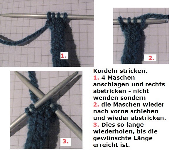 Gehäkelte Kordel ein- oder zweifarbig. Nur Luftmaschen leiern sehr schnell aus.