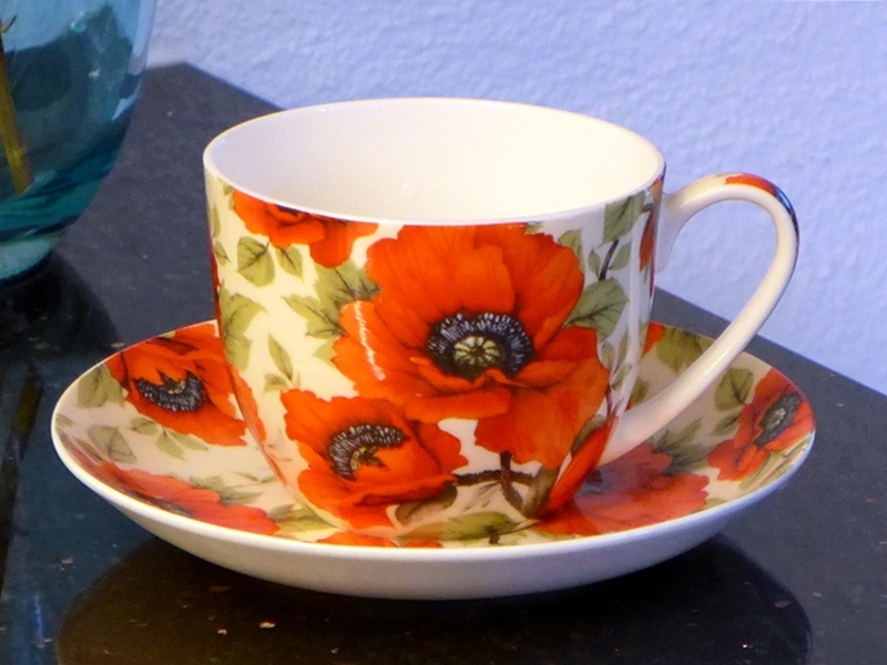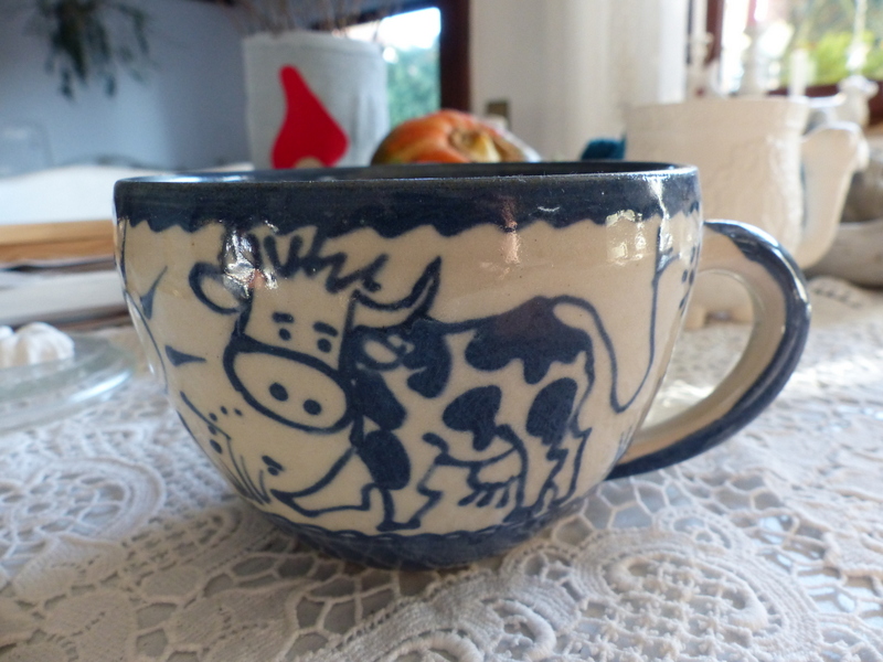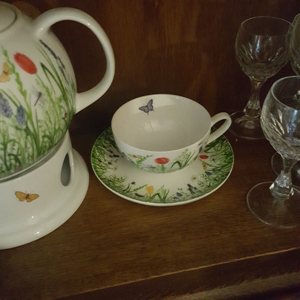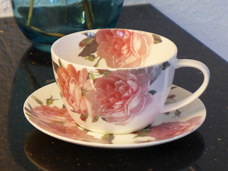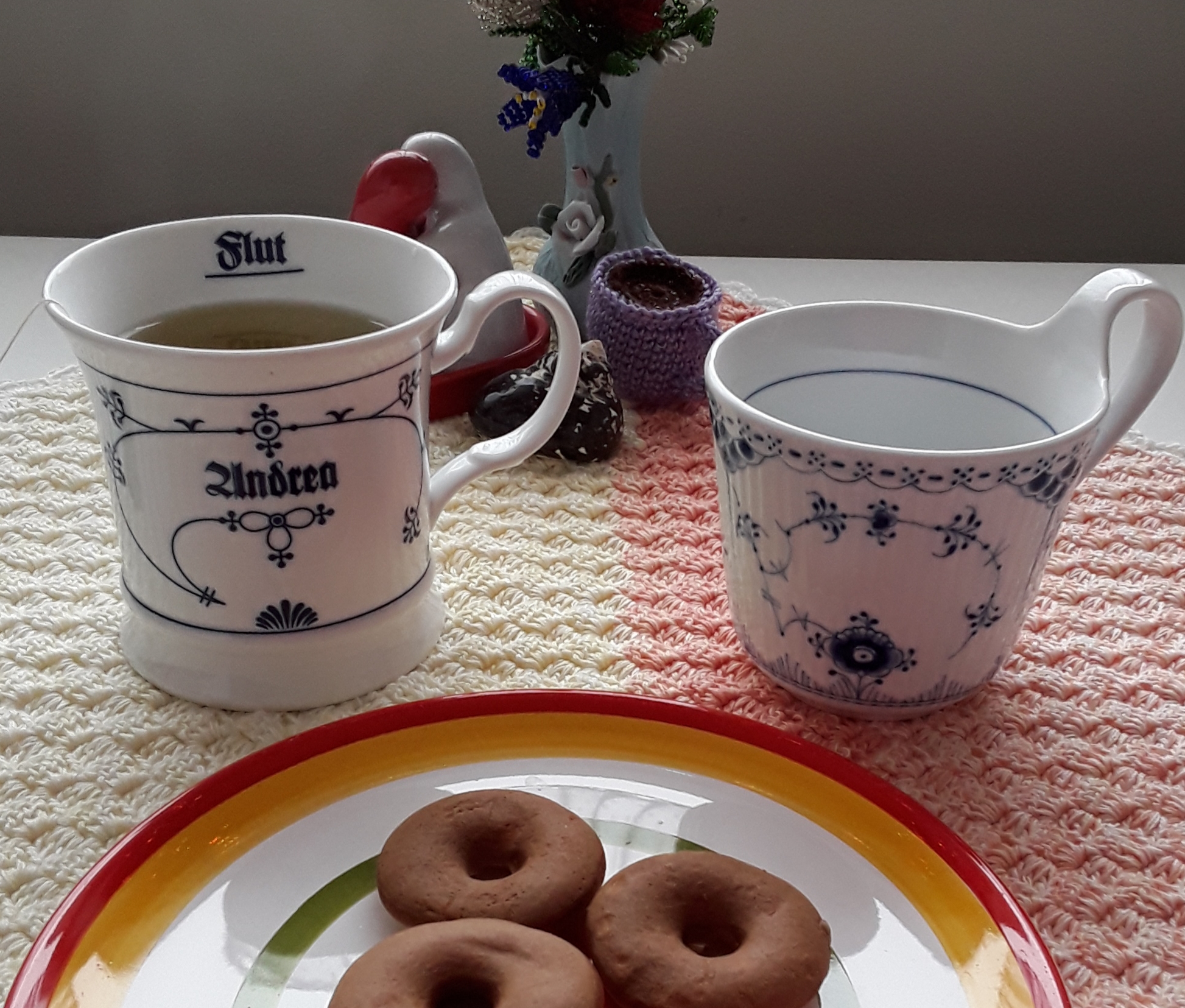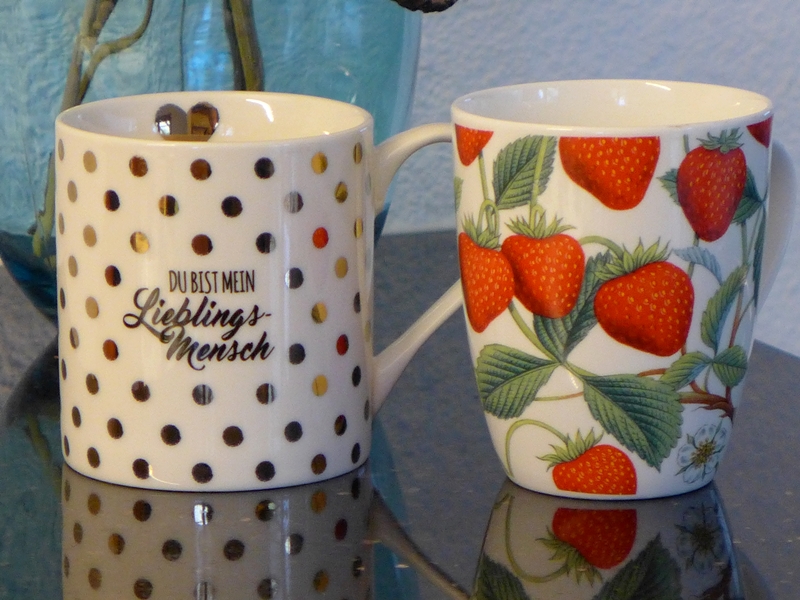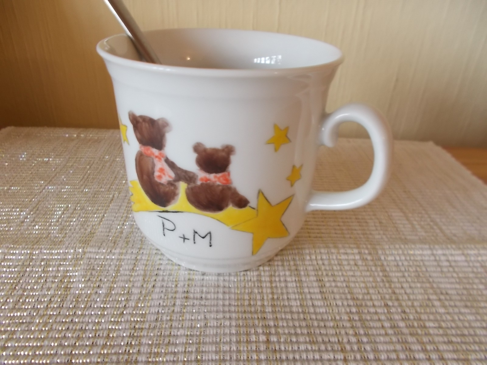 Meine absolute Lieblingstasse für Tee ist diese hier. Die hat mein Mann mir vor vielen Jahren auf dem Weihnachtsmarkt geschenkt und sie wurde nach Wunsch bemalt und beschriftet. Davon hab ich auch noch einen Teller. Das P + M bedeutet Peter und Monika.