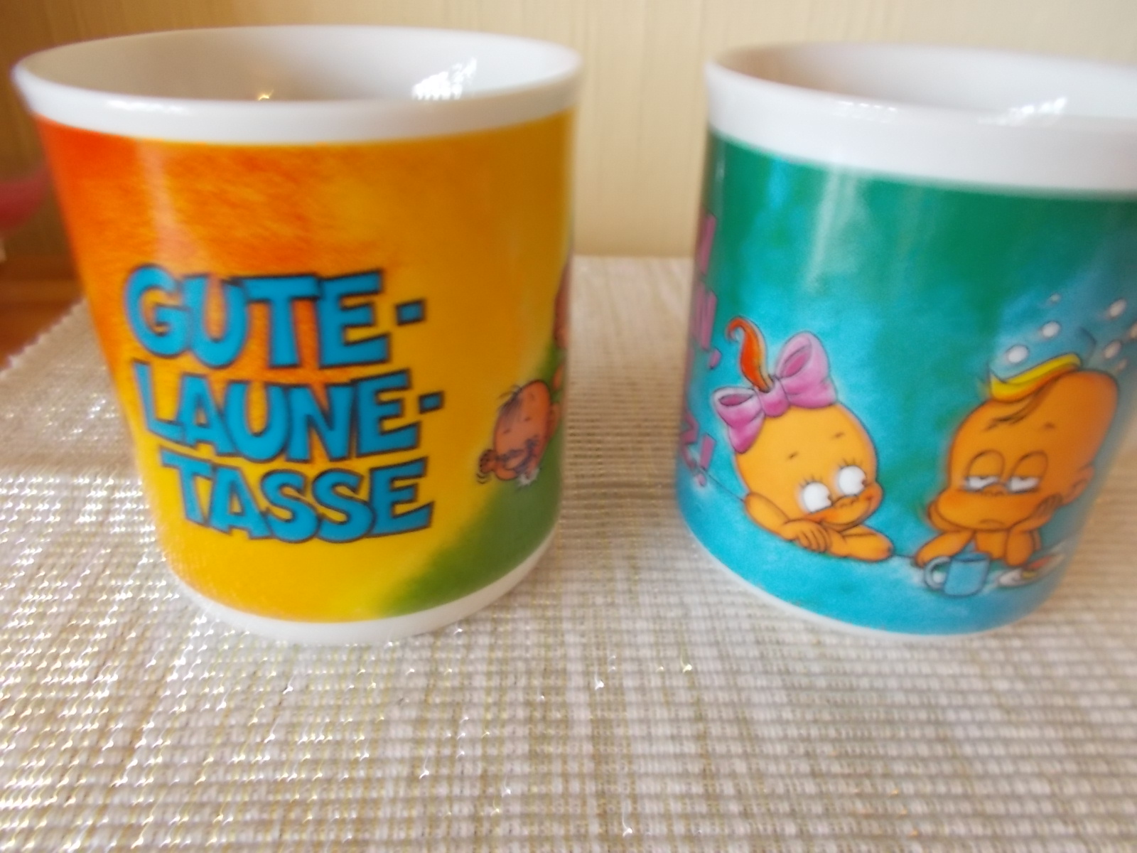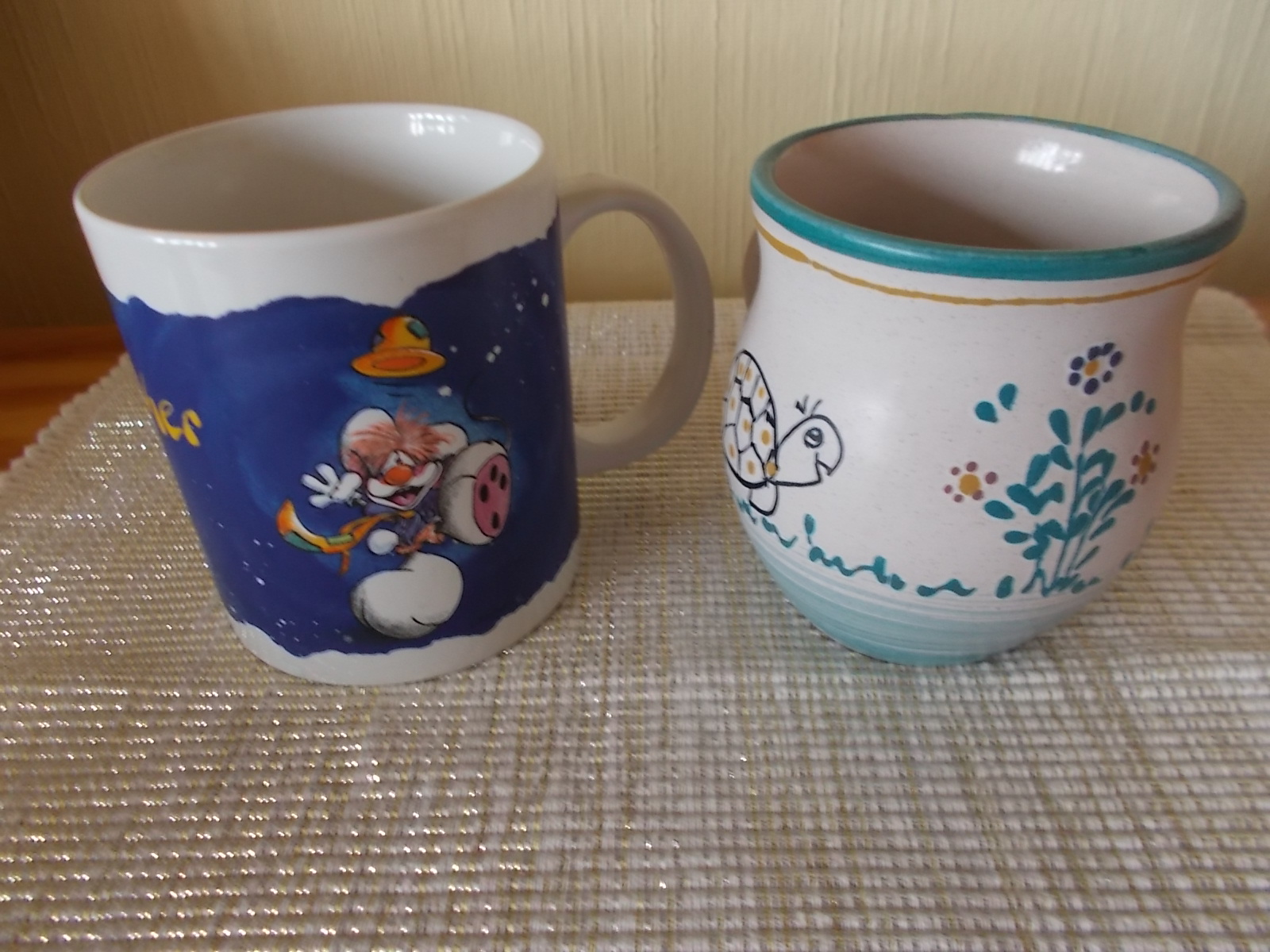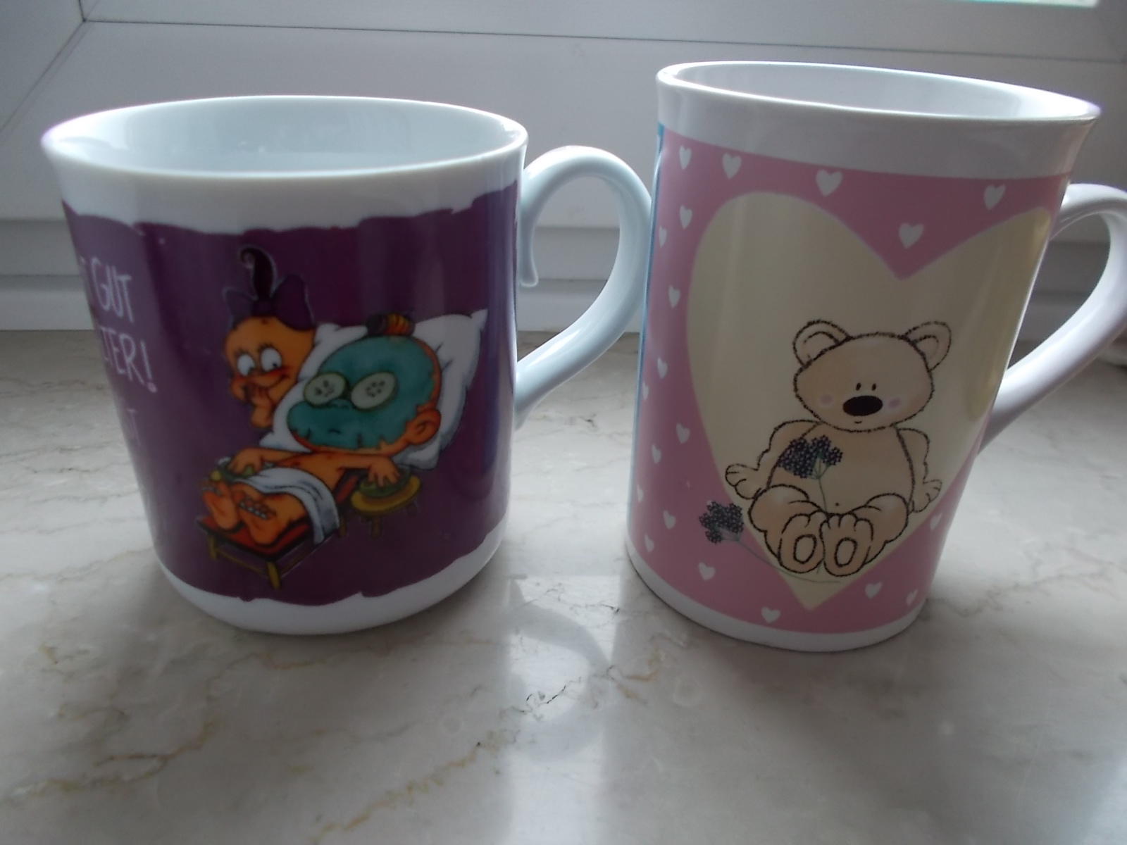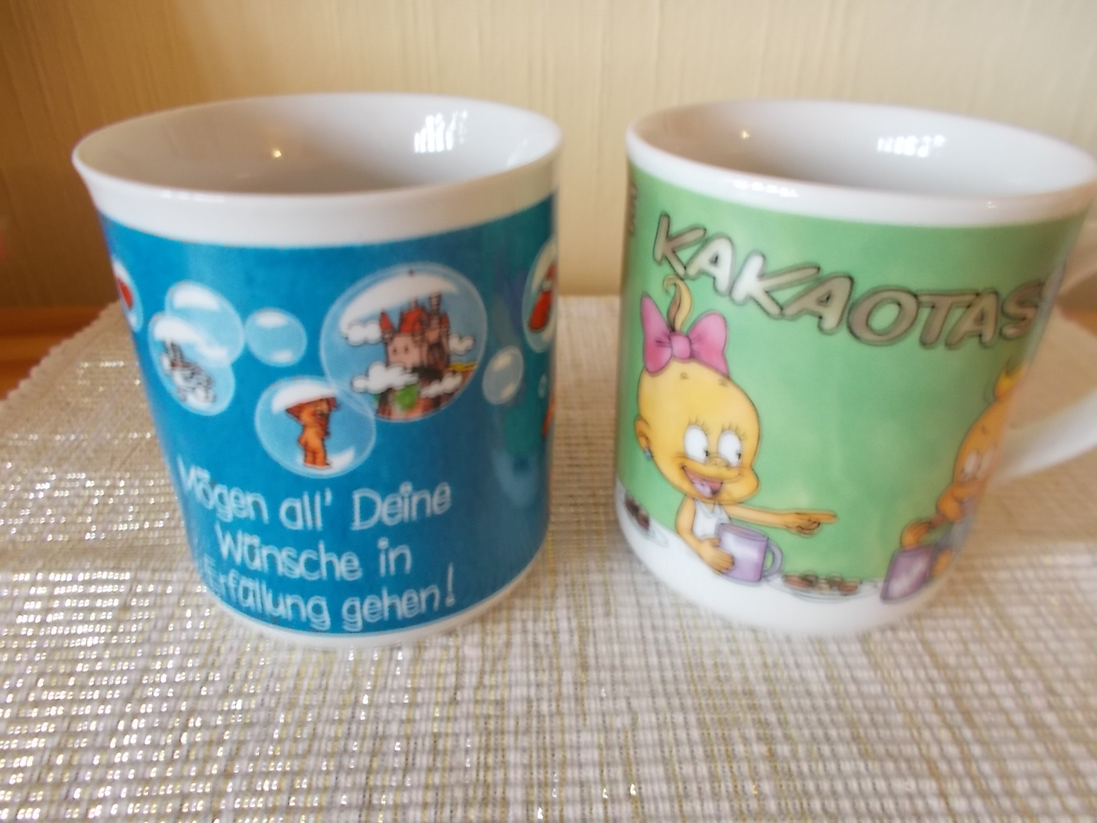 Handbemalt sind auch diese (linkes Bild) - beide aus einem speziellen Geschäft. Ich hab früher mal Schildkröten gesammelt - wie man sieht - und die beiden Schildi-Tassen sind noch aus dieser Zeit. Auf dem rechten Bild ist nur die eine handbemalt. Die andere ist meine Gute Laune Tasse von Diddl.