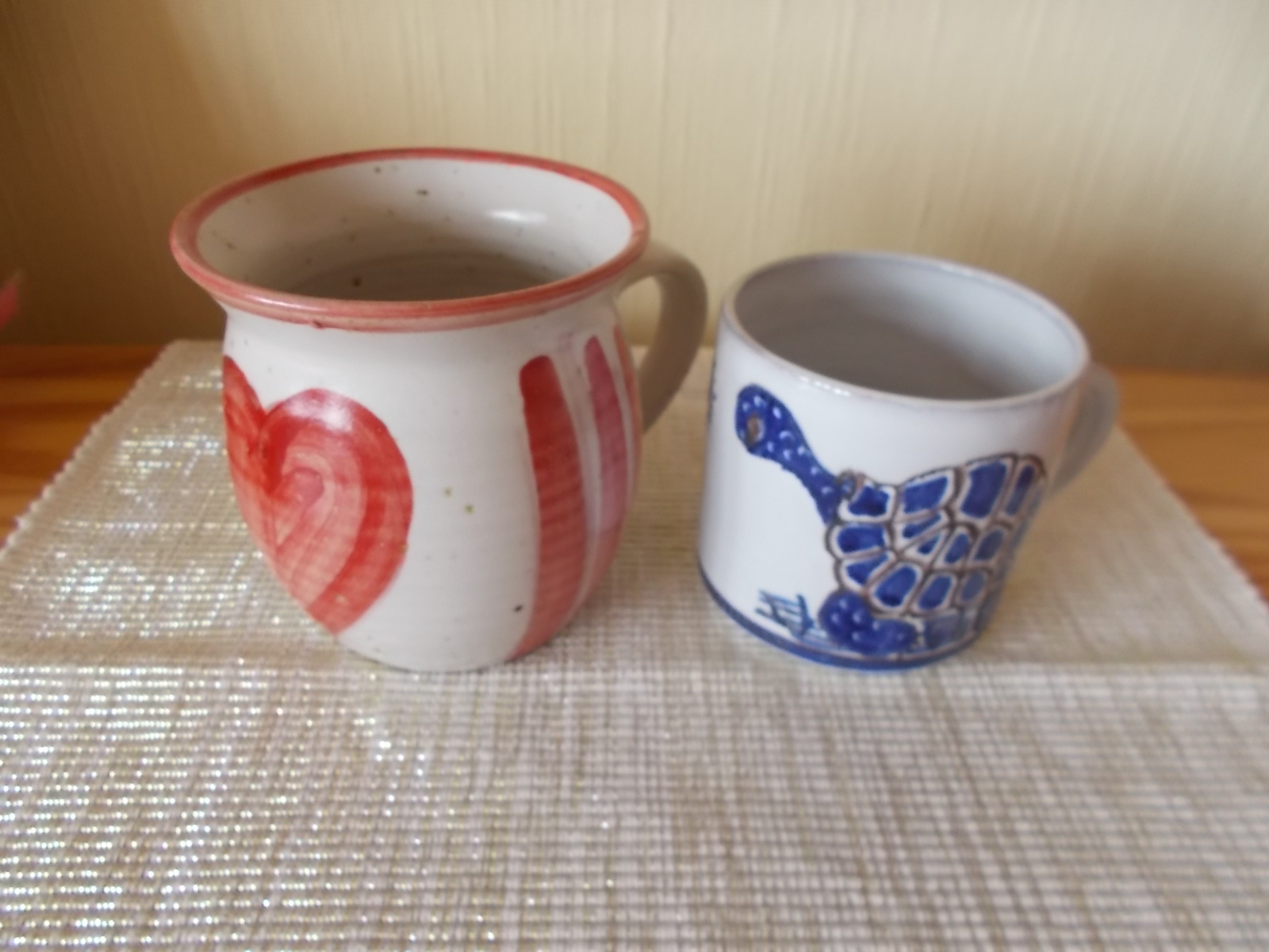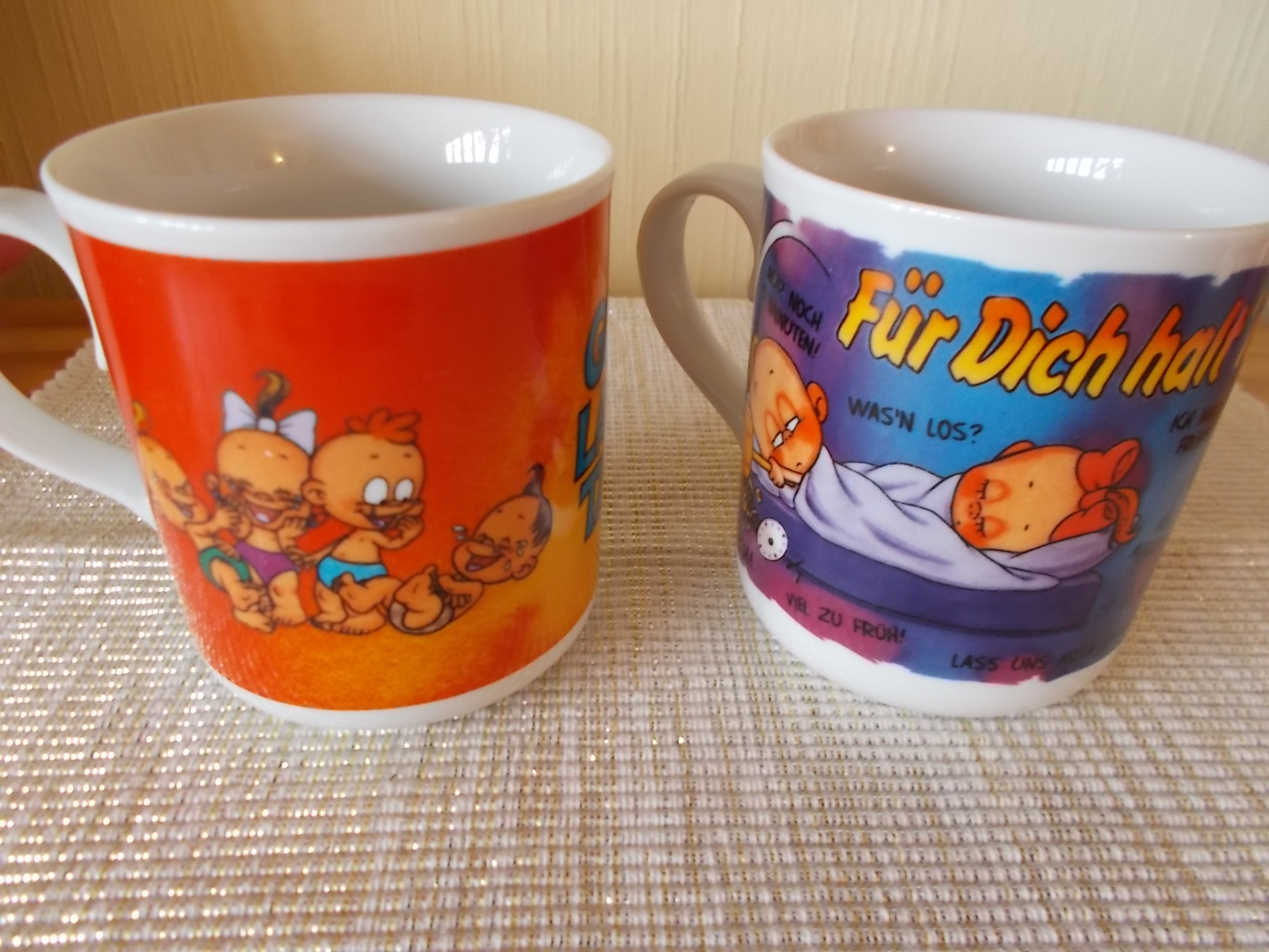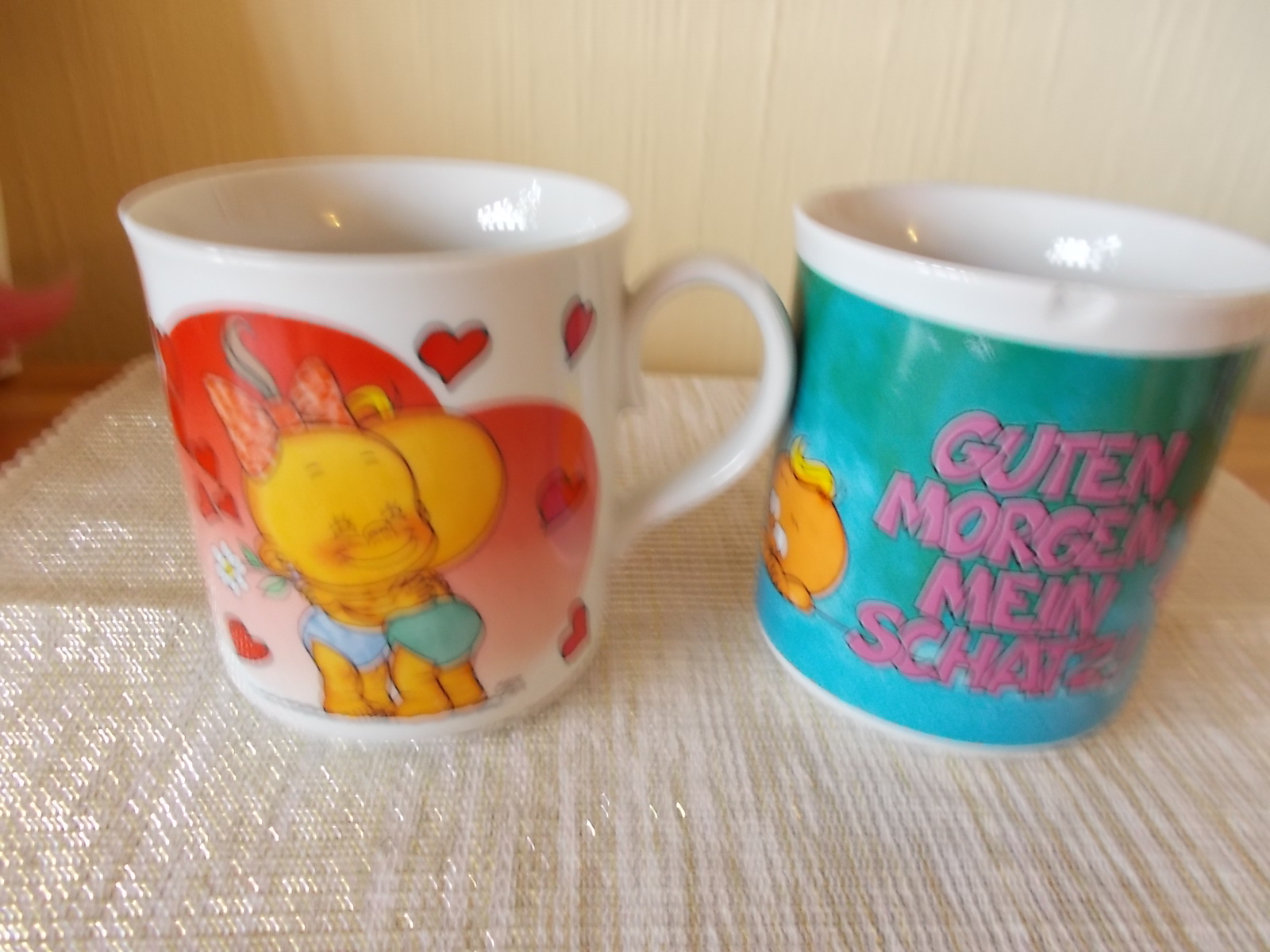 Handbemalt sind auch diese (linkes Bild) - beide aus einem speziellen Geschäft. Ich hab früher mal Schildkröten gesammelt - wie man sieht - und die beiden Schildi-Tassen sind noch aus dieser Zeit. Auf dem rechten Bild ist nur die eine handbemalt. Die andere ist meine Gute Laune Tasse von Diddl.