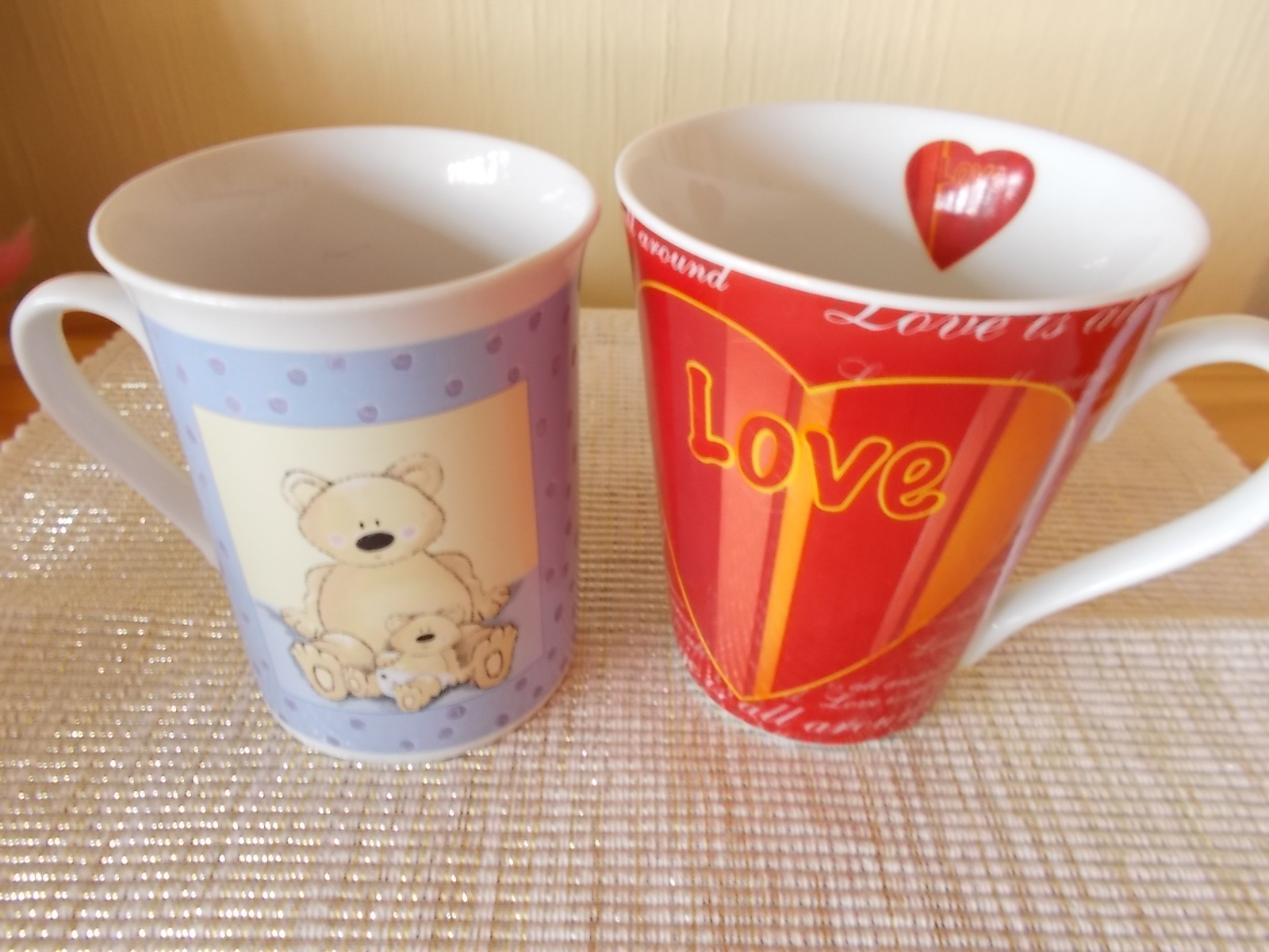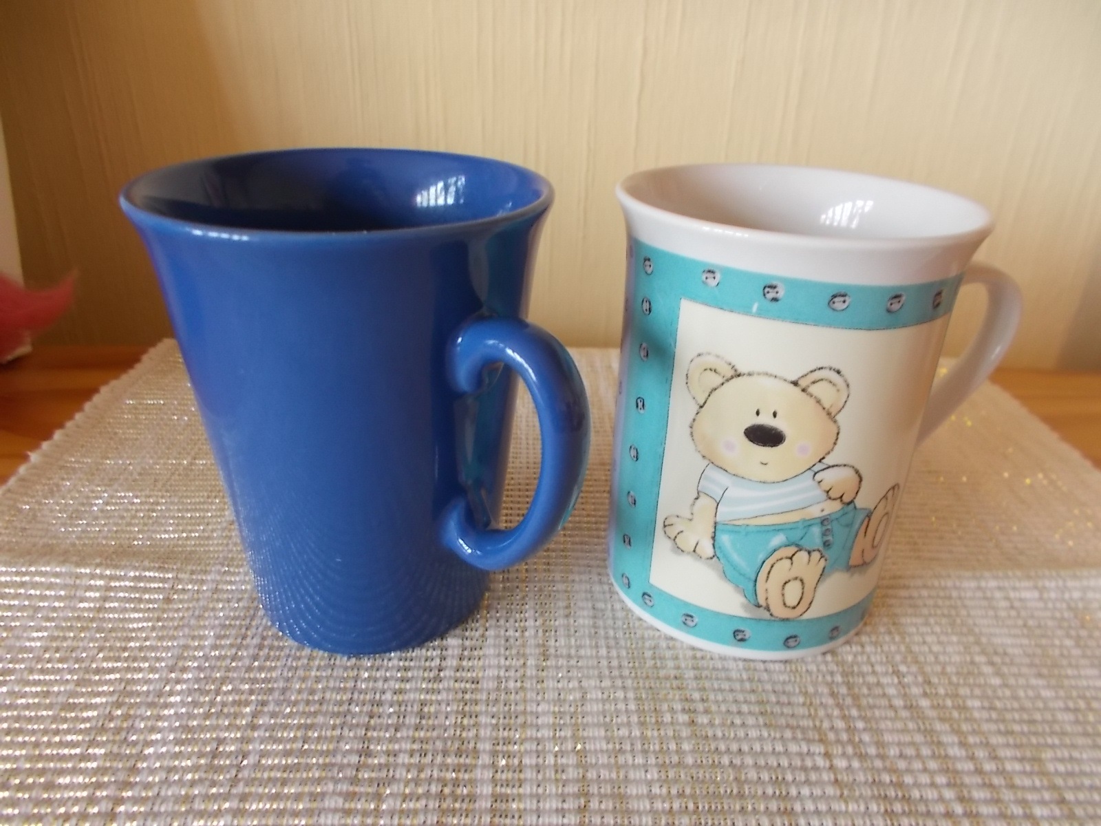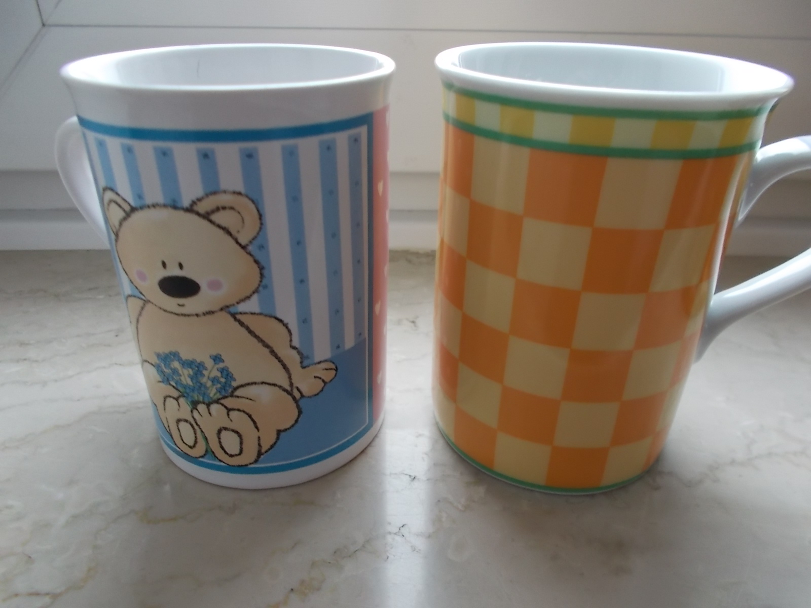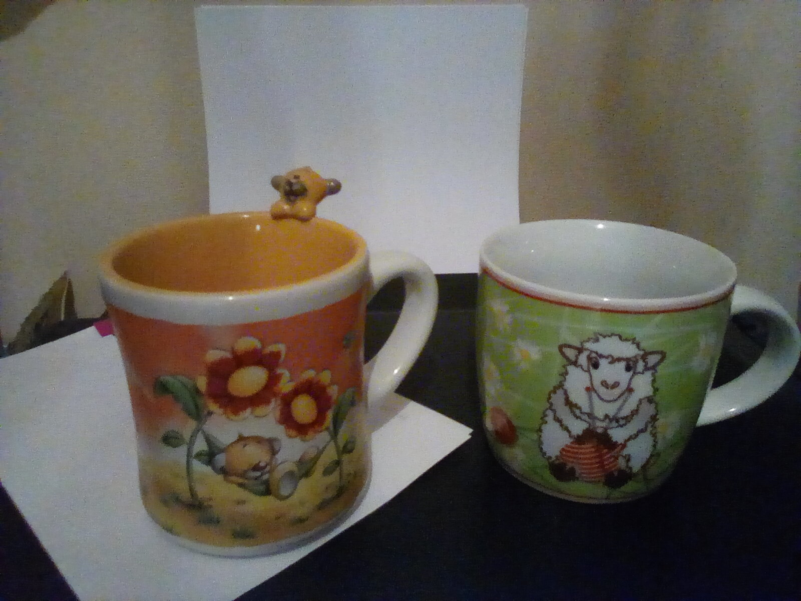Handbemalt sind auch diese (linkes Bild) - beide aus einem speziellen Geschäft. Ich hab früher mal Schildkröten gesammelt - wie man sieht - und die beiden Schildi-Tassen sind noch aus dieser Zeit. Auf dem rechten Bild ist nur die eine handbemalt. Die andere ist meine Gute Laune Tasse von Diddl.