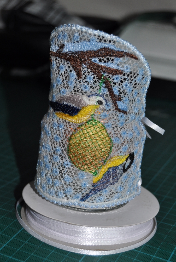 gestern gestickt und ziert jetzt mein Fenster vom Nähzimmer, ein Meisenpaar auf einem Speckknödel
