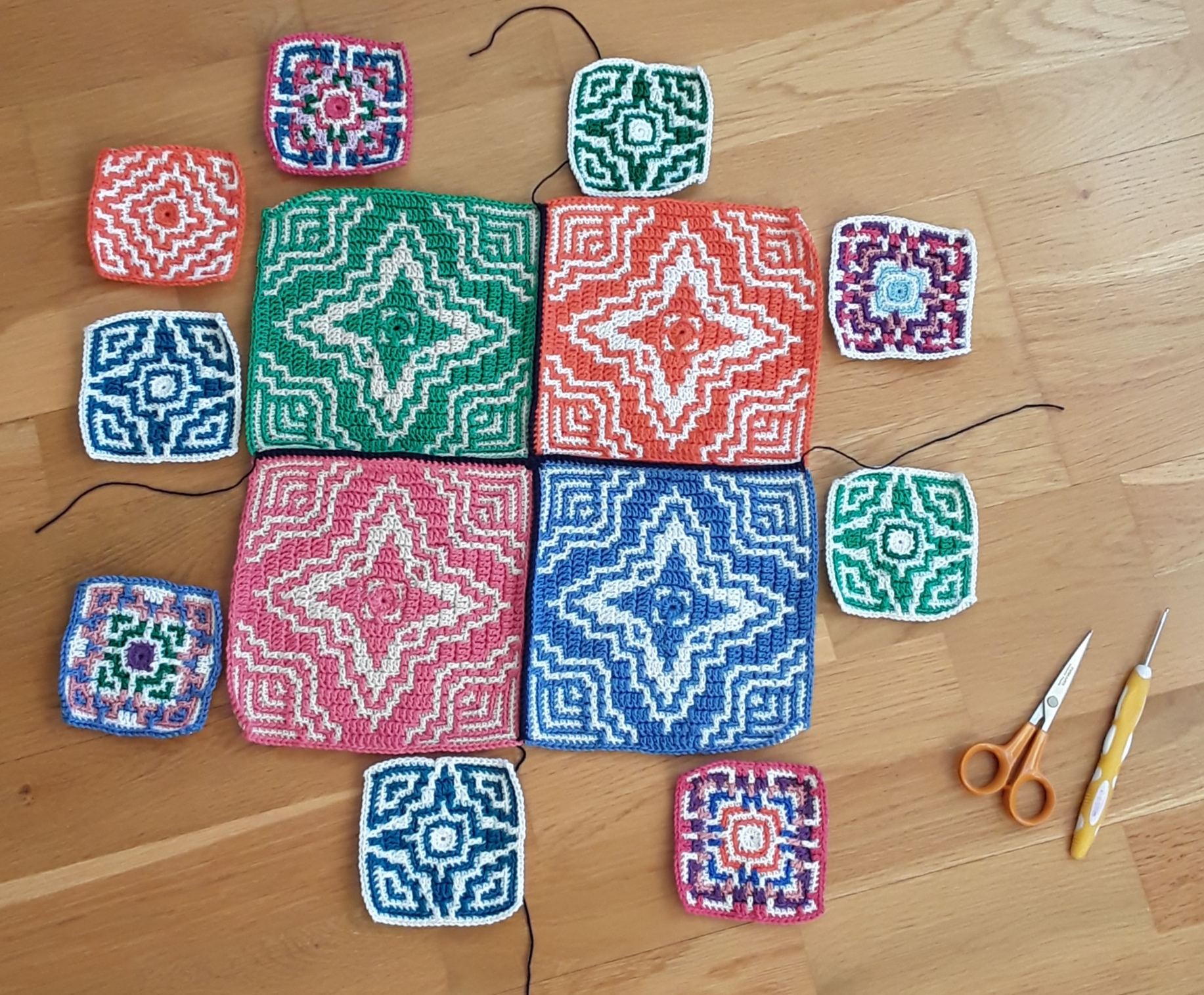 Ich kann auch wieder mal was zeigen. Bin immer noch beim Wollreste-Abbau. Da eignen sich wunderbar diese Mosaik-Grannys, und Mini c2c