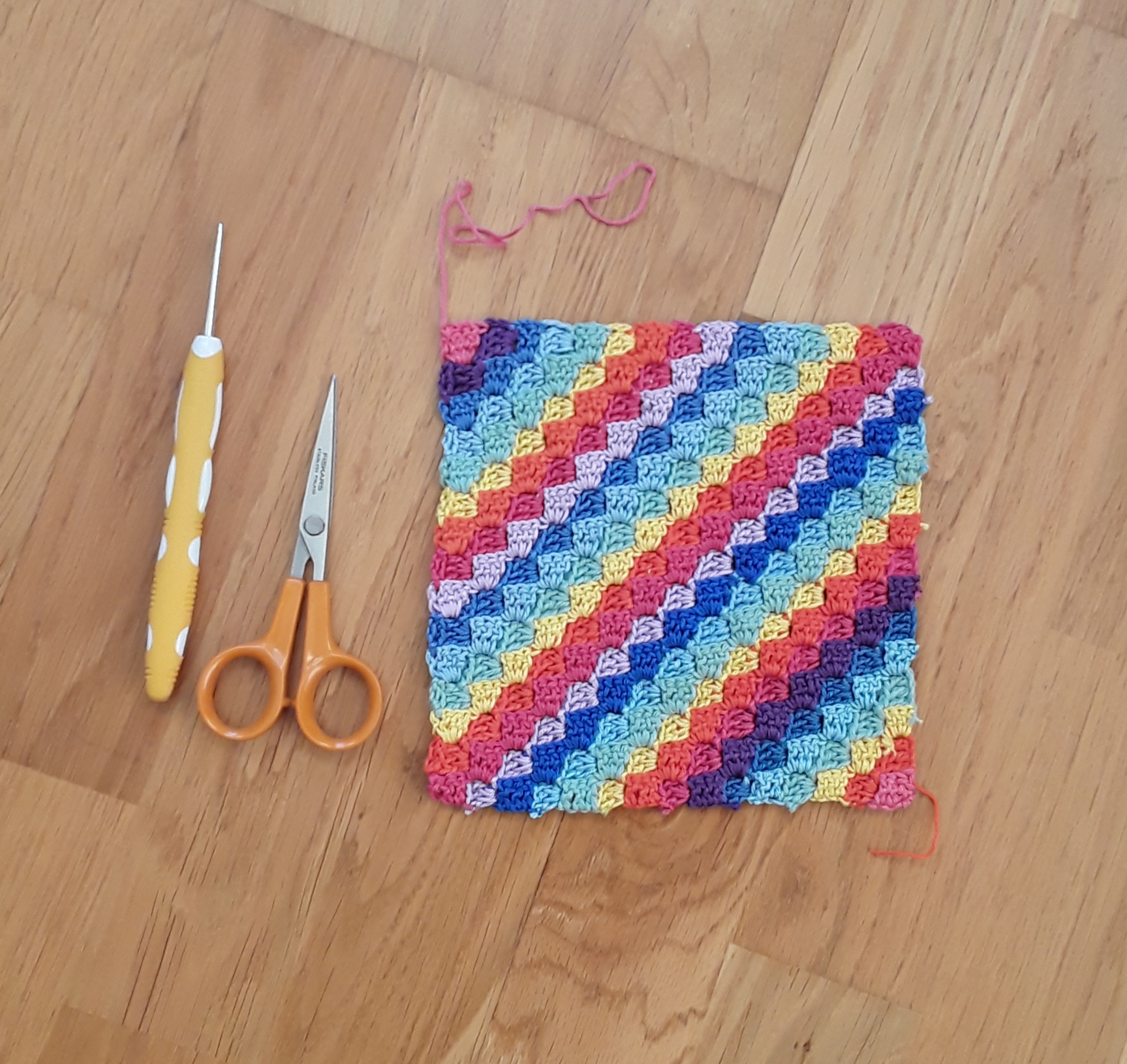 Habe auch wieder Wollreste verhaekelt. Bei diesem c2c Muster macht sich das super mit diesen Quadraten.