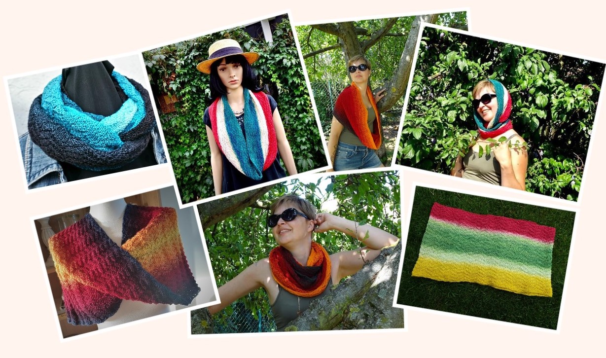 Der Treppen Cowl kann auch in verschiedenen Größen gestrickt werden, er kann mit Sockenwollstärke, aber auch mit 600m Farbverlauf gestrickt werden. Er wird nur mit rechten und linken Maschen gestrickt.