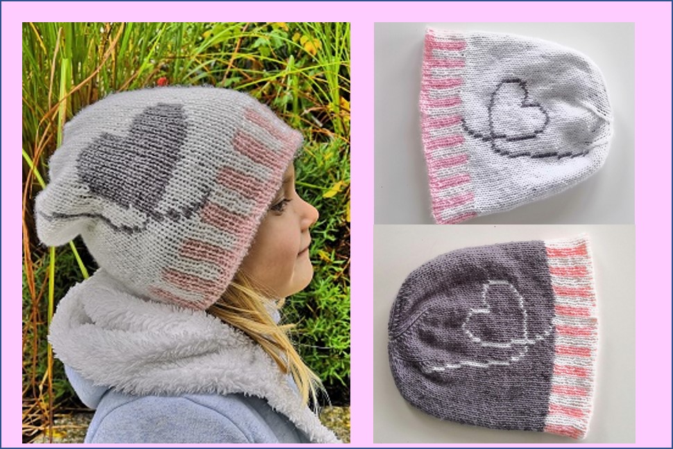 Auch dieses Verwandlungs-Trägerkleidchen für Kleinkinder hat eingestrickte Herzchen und es passt tatsächlich von 1,5 bis 5 Jahre. Es ist ebenfalls einfach zu stricken und hat keine Nähte.