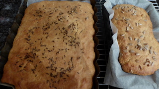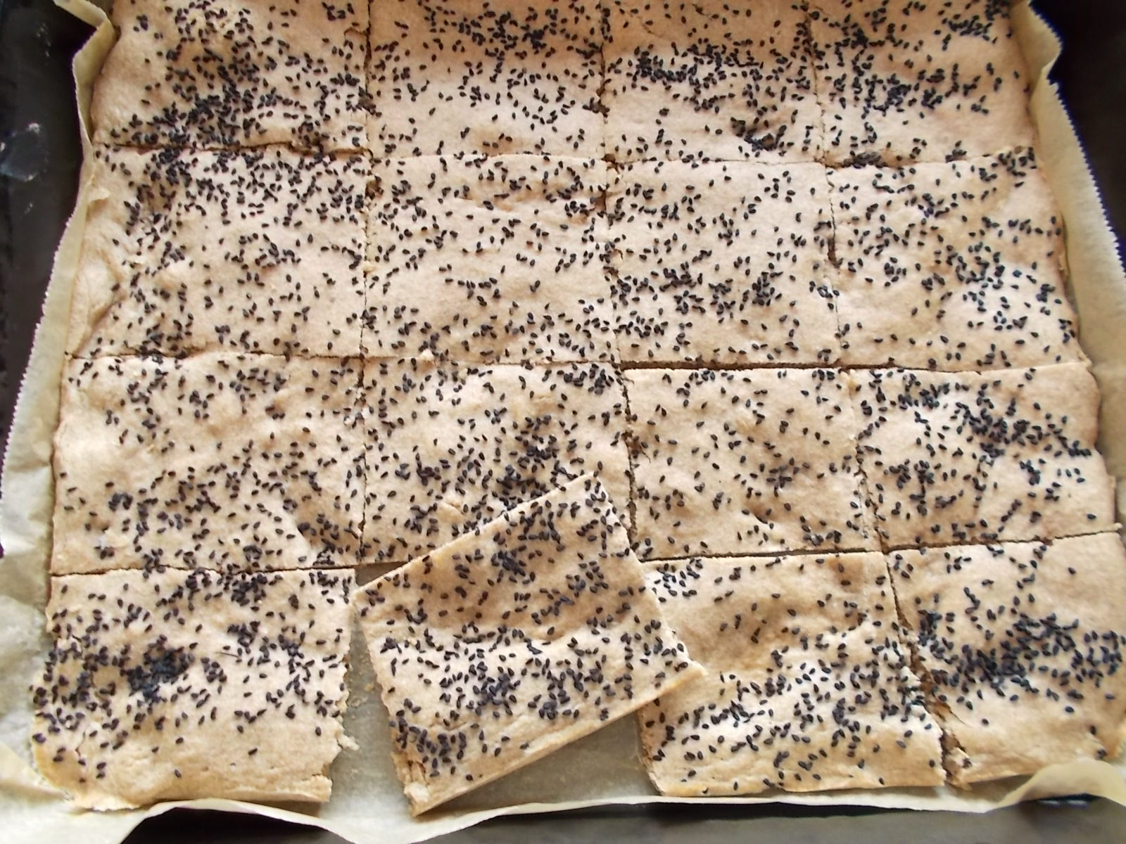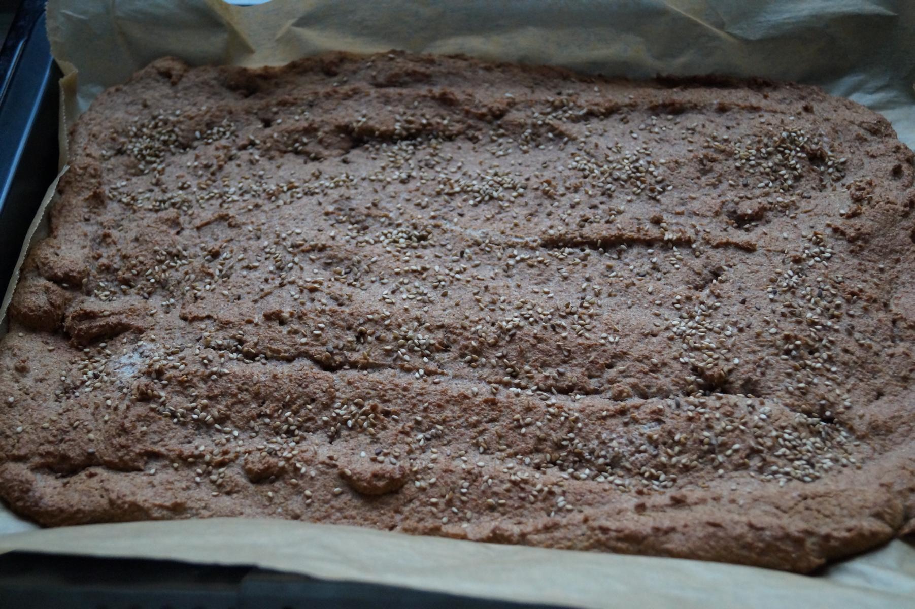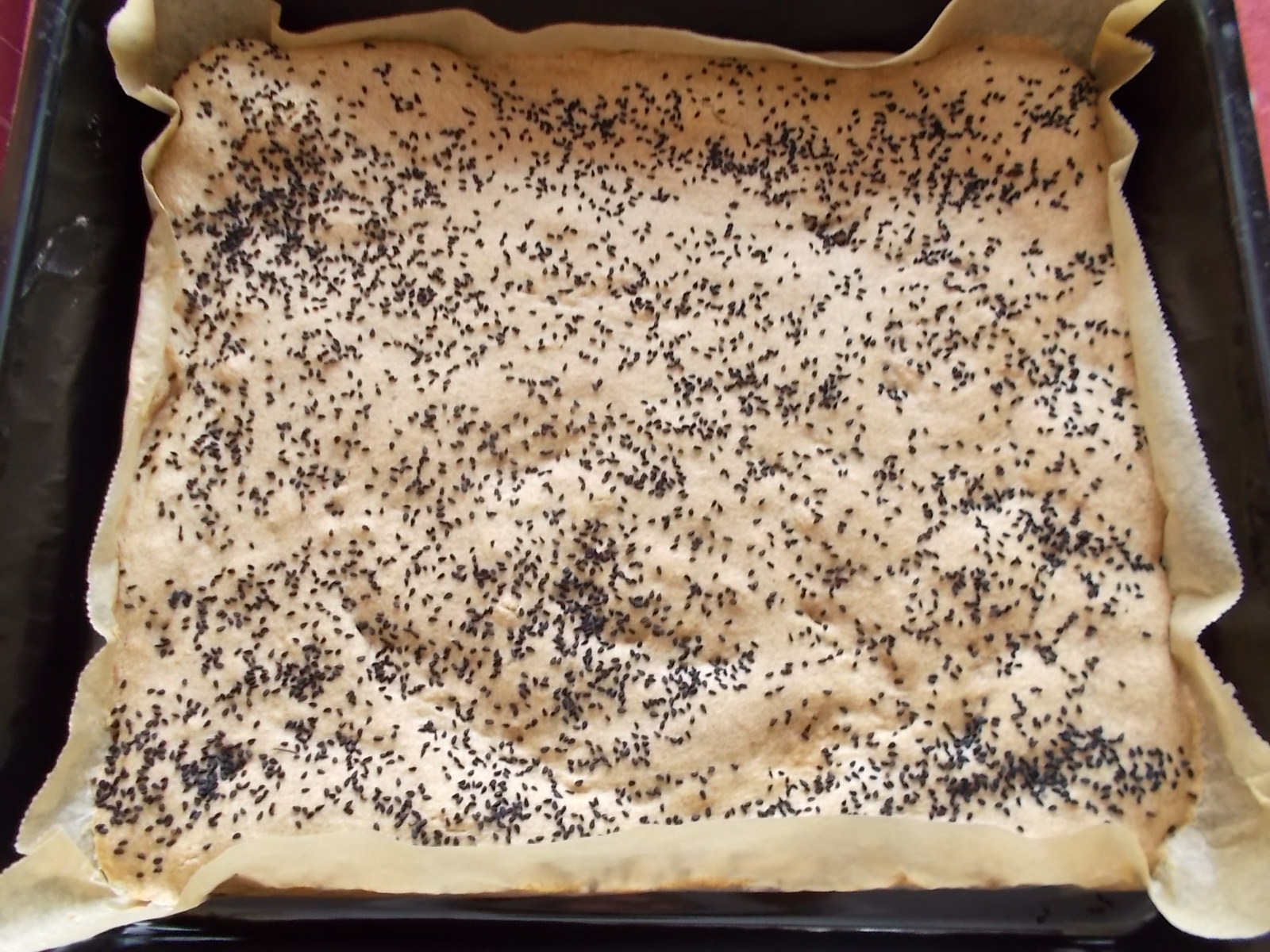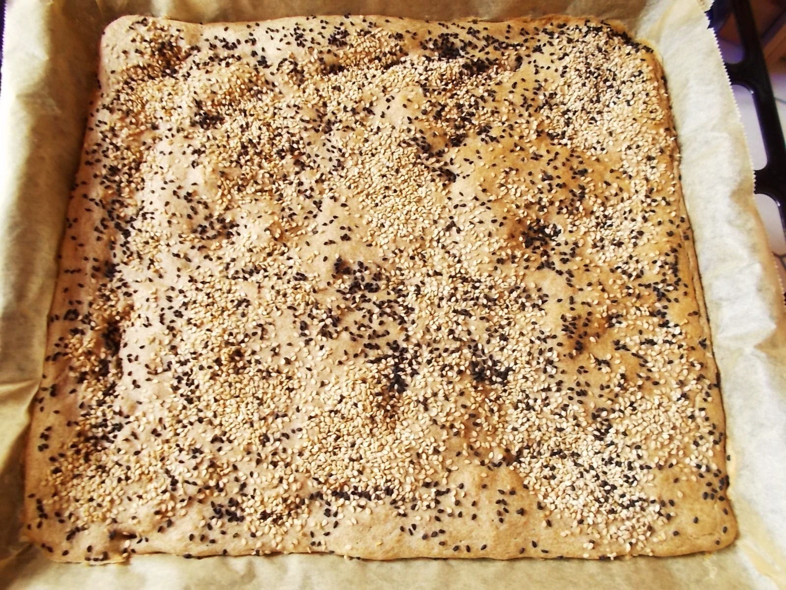Nun noch Körner nach Wahl drauf streuen. Ich nehme dafür gerne Schwarzkümmel. Es geht aber auch alles andere, zum Beispiel Sesam, Sonnenblumenkerne u.ä.