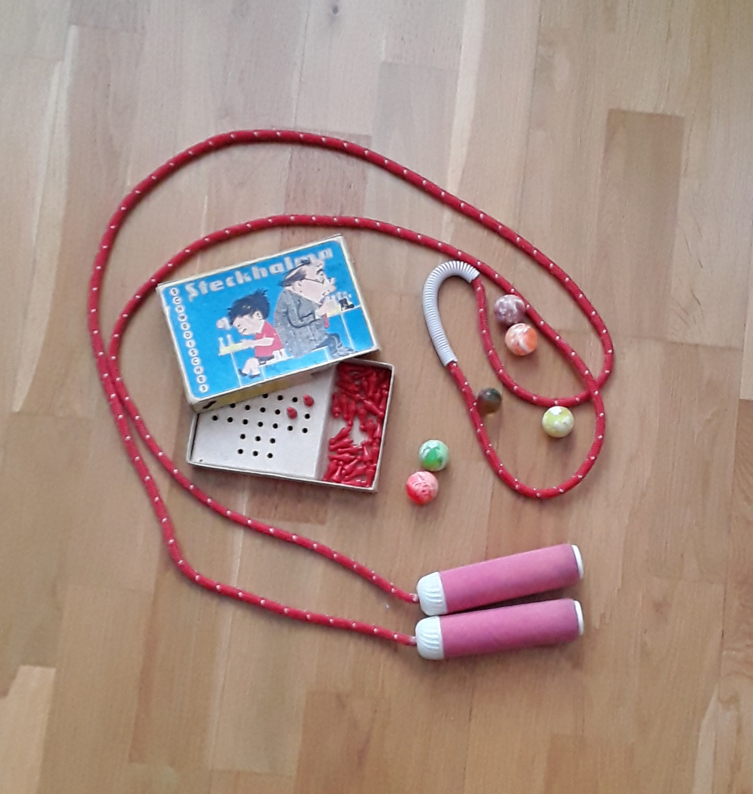 Ich hab noch ein Springseil, aber aus der heutigen Zeit (war ein moderneres Sportset mit 2 kleinen Hanteln und Expander dazu). Das benutze ich ab und zu, bissl Bewegung daheim.