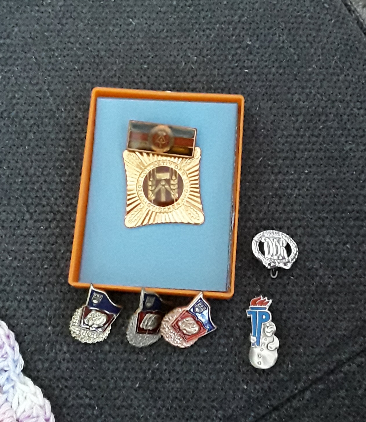 Unter anderem noch Abzeichen "fuer gutes Wissen" "Kollektiv der sozialistischen Arbeit", und sogar noch alte DDR-Schecks