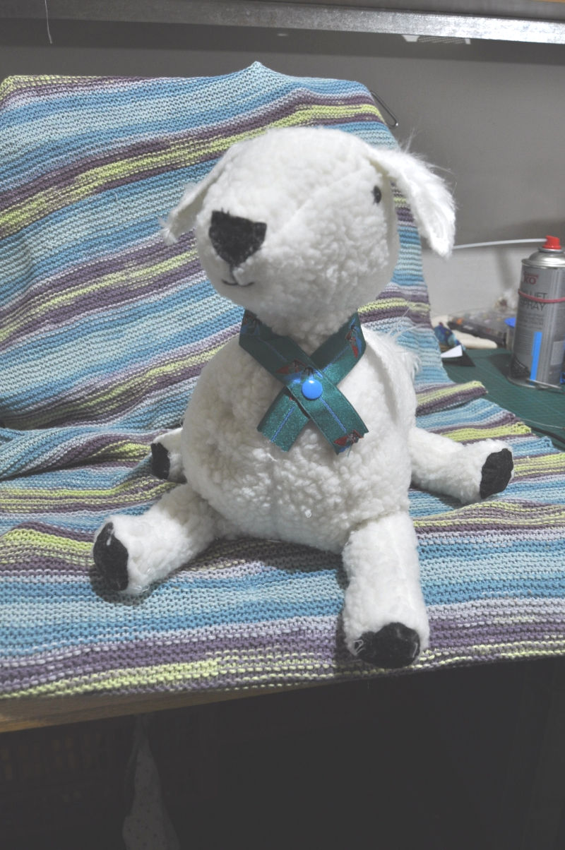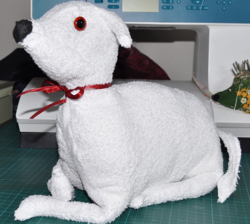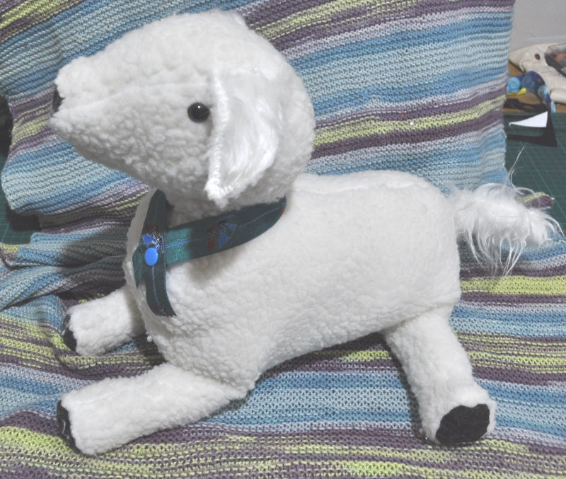 hab den Hund meiner Tochter mal als Welpe nachempfunden, sie haben einen Kuvac, einen ungearischen Hirtenhund. Nachdem ich die Familie als Puppen nachempfunden hatte fragte mich meine Tochter ob ich auch Flocke machen könne, sagte ihr das dauert aber denn ich muss Schnitt usw erst entwerfen und Probenähen. Nach Tagelanger Arbeit kam erst ein *Schaf* raus, das war der erste Schnitt, gut das ich da Probenähte, so sah ich wo ich ansetzen mussrte um den Schnit so zu bekommen wie ich es wollte. Zeige euch das *Schaf aber auch, denn als solches isses nedmal so schlecht :-), hab für das probenähen alten Frotteestoff genommen, man den zu wenden war Schwerstarbeit, knüppelhart das Zeug