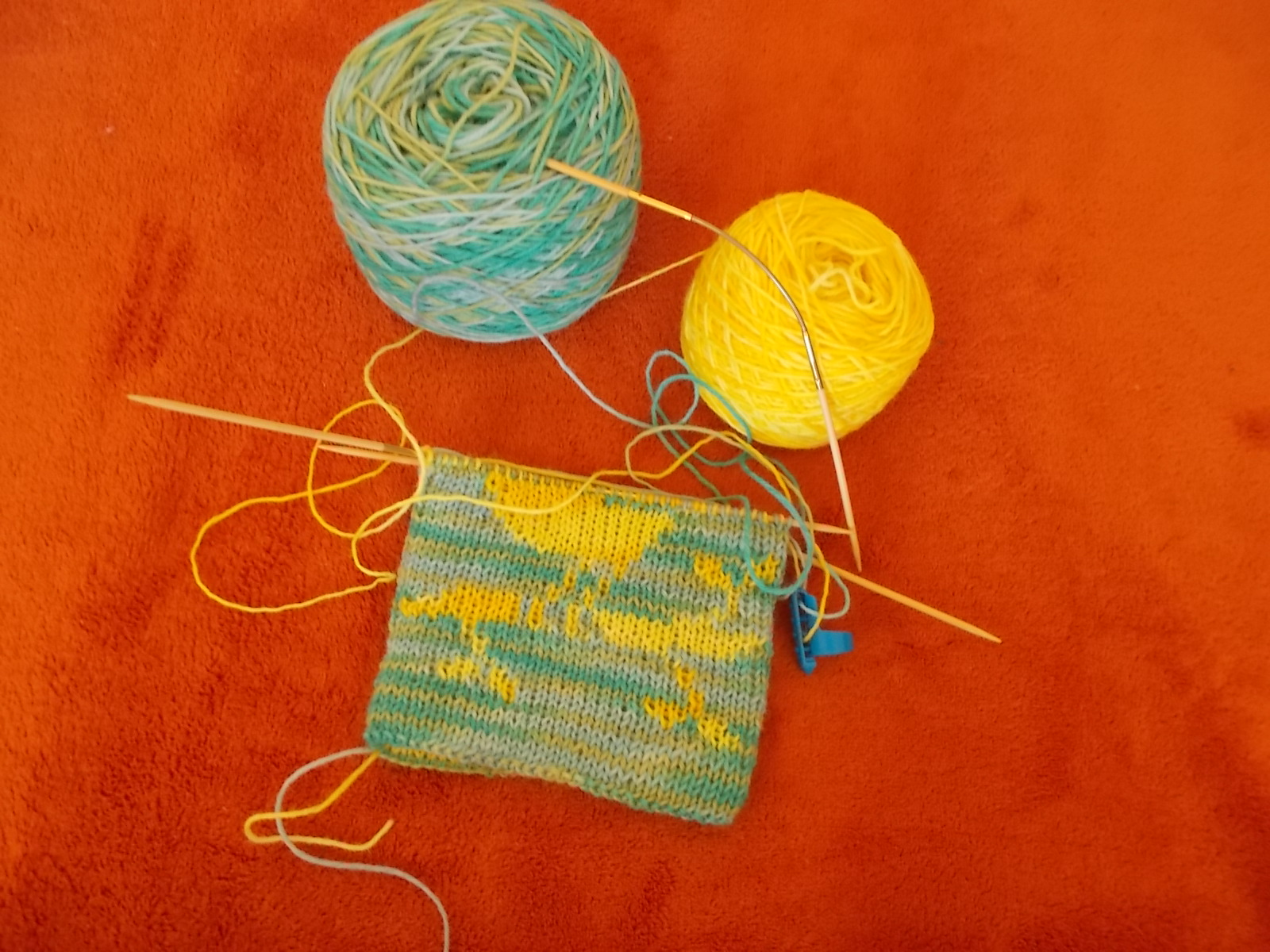 Nachdem ich gestern Abend schon fast aufgeben wollte, sie zu stricken, hab ich nun heute eine neue Lösung gefunden. Ich musste alles wieder aufribbeln, weil die Hülle viel zu groß geworden wäre. Heute hab ich mal meine Vorräte durchgesehen und tatsächlich was Geeignetes gefunden. Es ist dünne Sockenwolle in hellem Grün und Gelb. Da sind dann wahrscheinlich die Kontraste nicht so stark, aber was soll's. Der Anfang ist jetzt gemacht und sie hat die Maße, die ich brauche, zum Glück.So sehen die Farben aus: