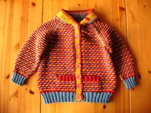 Eine warme Strickjacke aus Merinowolle ist jetzt im Frühjahr genau die passende Kleidung, wenn Kleinkinder draußen spielen. Sie hat Taschen und eine Kapuze und passt von ca. Größe 92 bis 104.