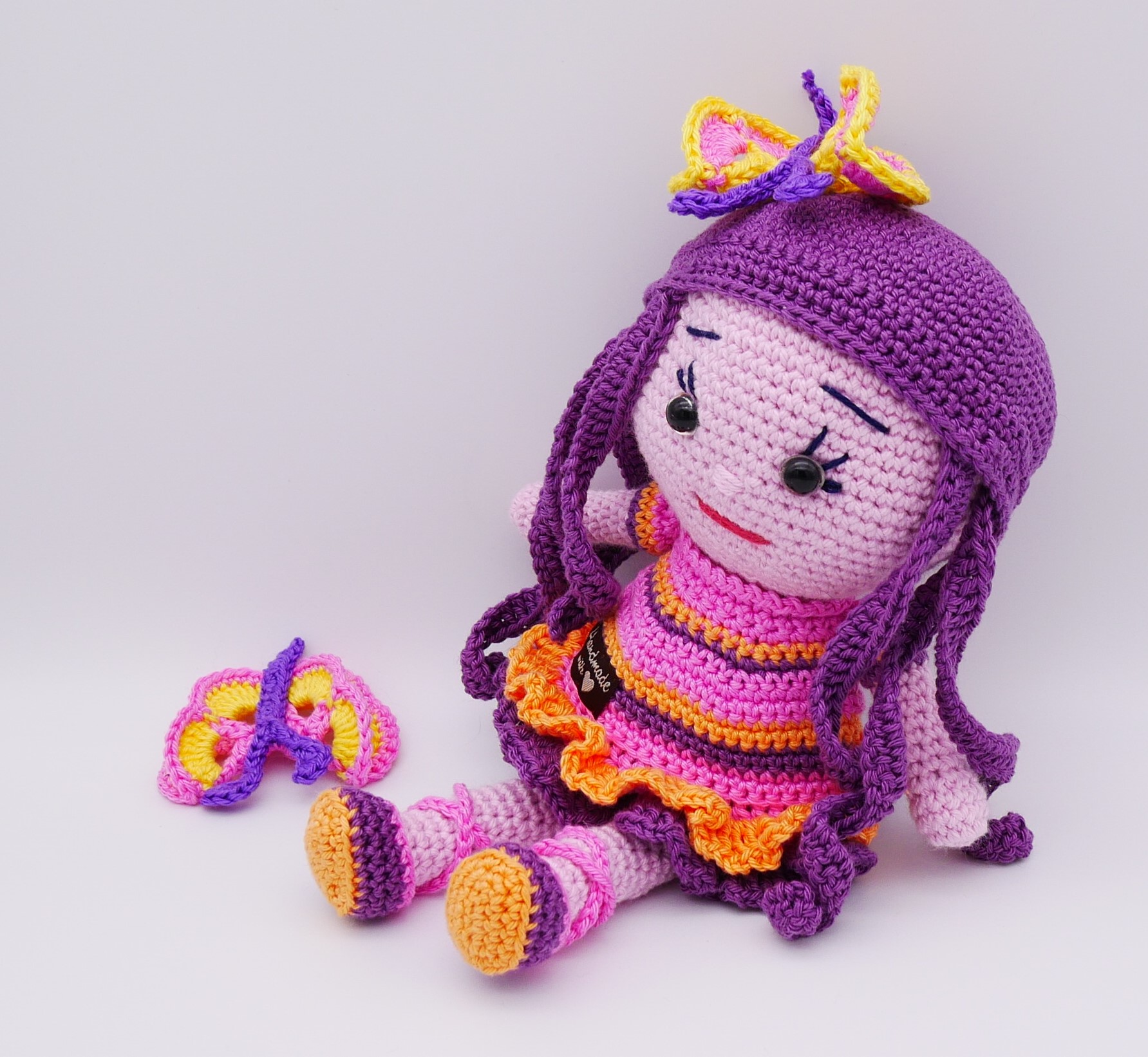 Püppchen Sarah, kann auch neu eingekleidet werden. Kleider, Schuhe, Haarpracht, Unterwäsche sind extra gearbeitet und können ausgezogen werden. Auch die Schmetterlinge sind in der Anleitung enthalten