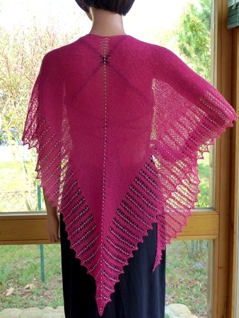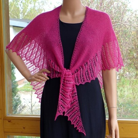 Das streckt besonders durch seine spitzwinklige Form. Der Schick kommt vom Perlenrand. Hier sind kleine Rocailles-Perlen eingestrickt. Die Perlen-Bordüre kann man so breit machen wie man möchte, denn das Muster ist endlos fortlaufend. Das Tuch ist aus Kaschmirwolle gestrickt und damit wunderbar weich und anschmiegsam. Man kann es vorne offen wie eine Stola über den Schultern oder geknotet tragen.