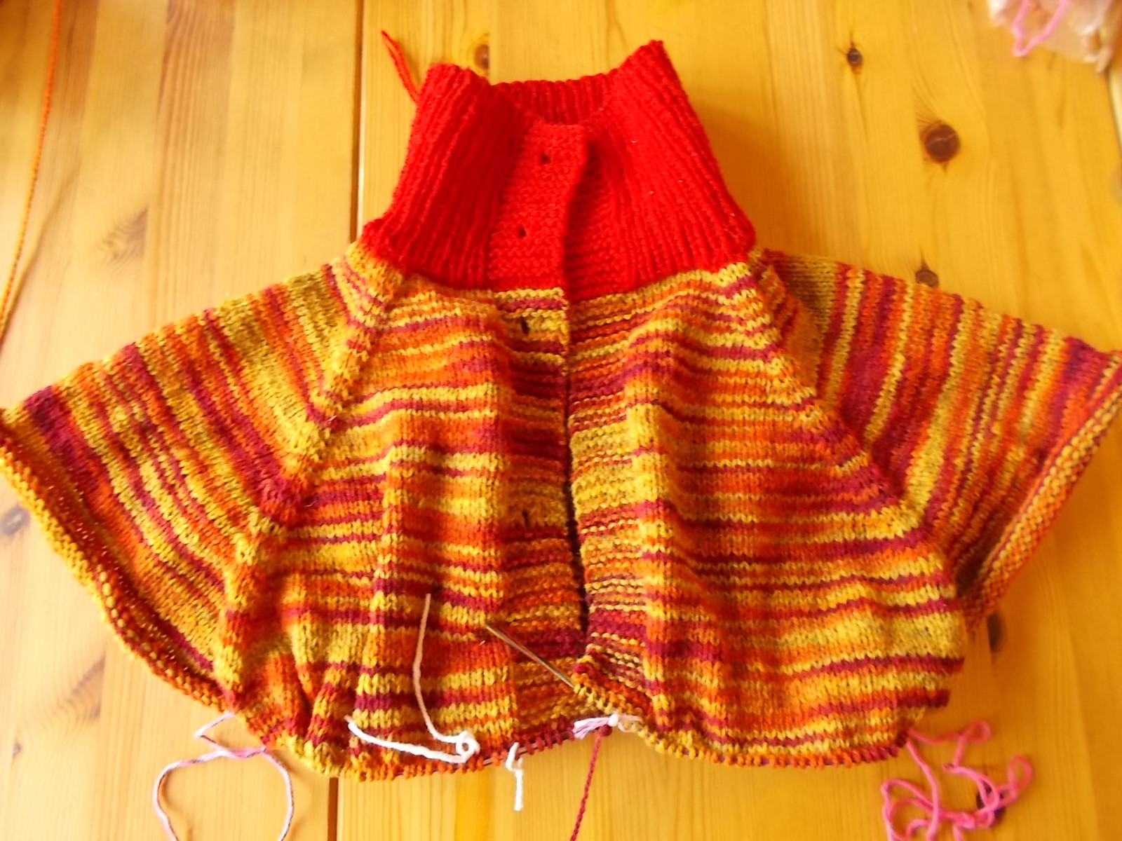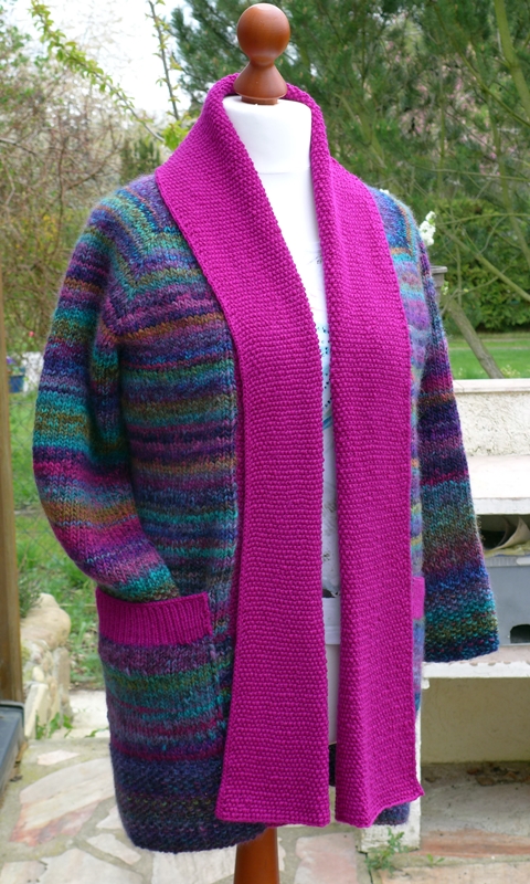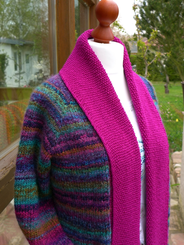 Bei mir ... ist jetzt endlich die Strickjacke fertig! Da es meine ist und ich Strickjacken immer offen trage (weil schnell anziehen, Hitzeflash, schnell ausziehen), brauche ich keinen Verschluss und vielleicht auch keinen Gürtel. Das überlege ich mir dann noch beim Tragen. Ihr müsst leider mit dem Bild an meiner Kleiderpuppe vorlieb nehmen. Mein Mann mag nicht fotografieren.