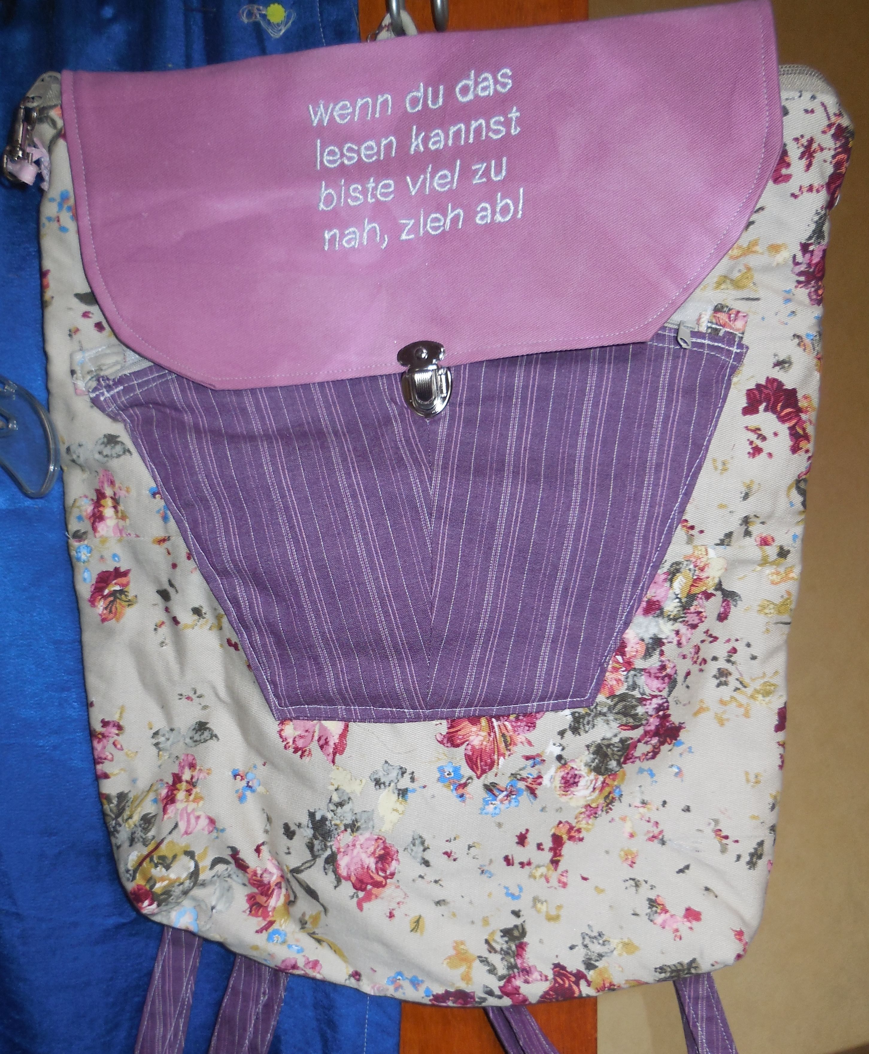 am liebsten wenn es denn mal sein muss besticke ich meine Kleidung selber mit einem Spruch, meiner einen Tochter schenkte ich einen Rucksack den ich mir mal aus einem altem Kostüm von mir nähte mit folgendem