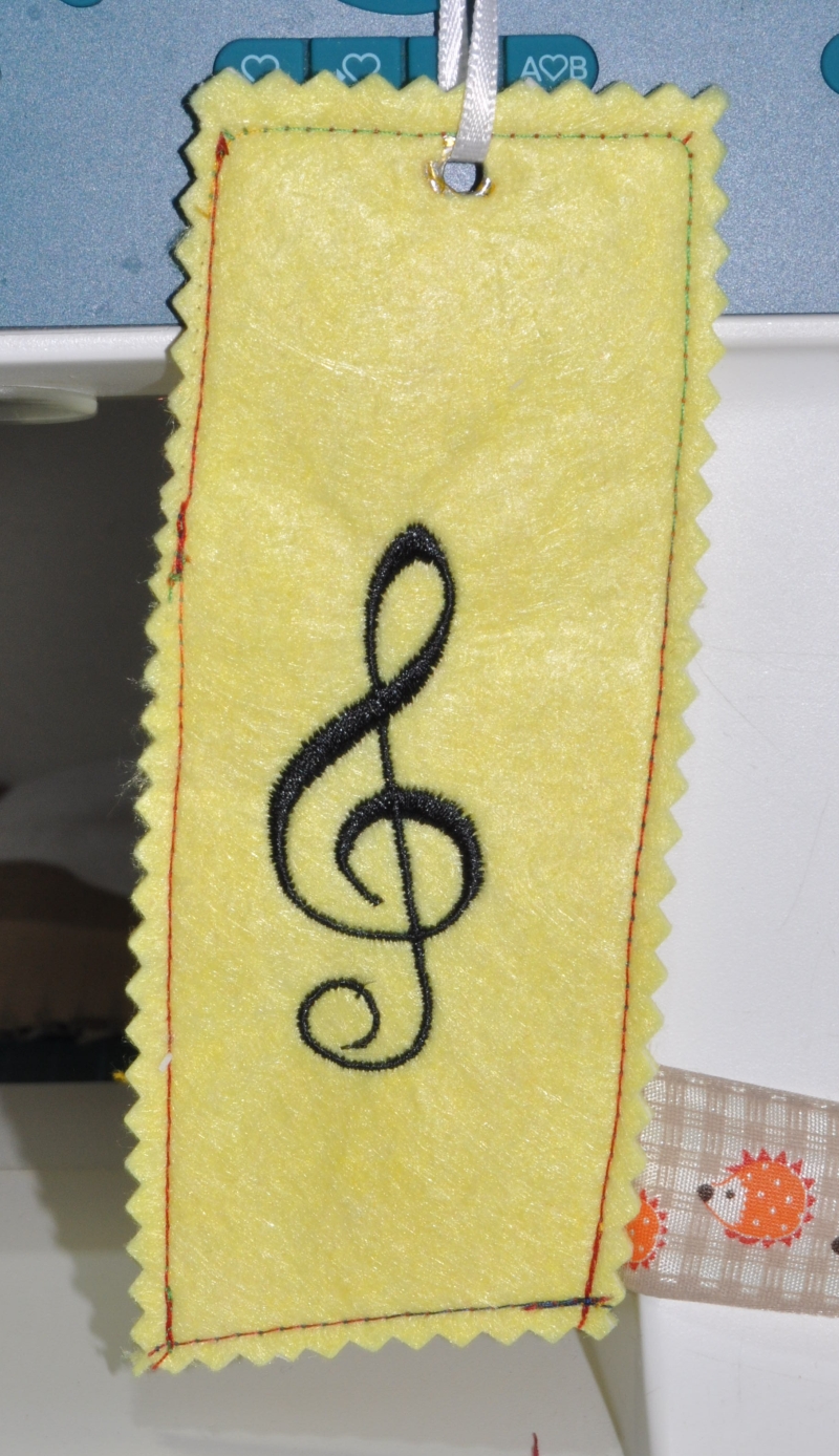 ich hab einen Taschenbaumler für meine Tochter entworfen und auf der Sticki gestickt, sie macht zir Zeit Auffrischungskurse mit Alt und Tenorflöte, beide Instrumente lernte sie schon als Kind spielen. Auf die eine Seite einen Flöte und auf die andere einen Notenschlüssel gestickt, als trägermaterial hab ich Filz genommen