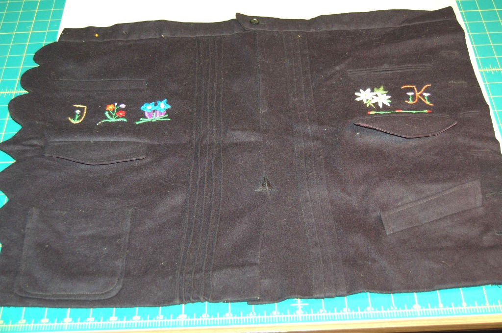 aus meiner Lehrzeit, da sind einige Arten von Falten und auch Biesen drauf, sowie Klappen von Taschen und die berühmt berüchtigte Fliege an Falten, das die ned ausreißen nach oben hin. Die Stickereien da draus sind mit Knopflochgarn gearbeitet, sowas mussten wir auch machen. Das ganze Teil ist leider sehr dunkel, habs jetzt ml etwas bearbeitet, so sieht mans etwas besser