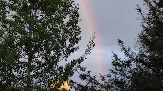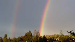 Auch Regenwetter hat manchmal seine schönen Seiten: Vorgestern Abend entdeckte ich beim Blick aus dem Küchenfenster diesen prächtigen Regenbogen und - kaum zu glauben - aus einem andern Fenster gleich noch das andere Ende! Wir konnten uns kaum satt sehen an diesem Naturschauspiel, das erst noch ungewöhnlich lange dauerte!