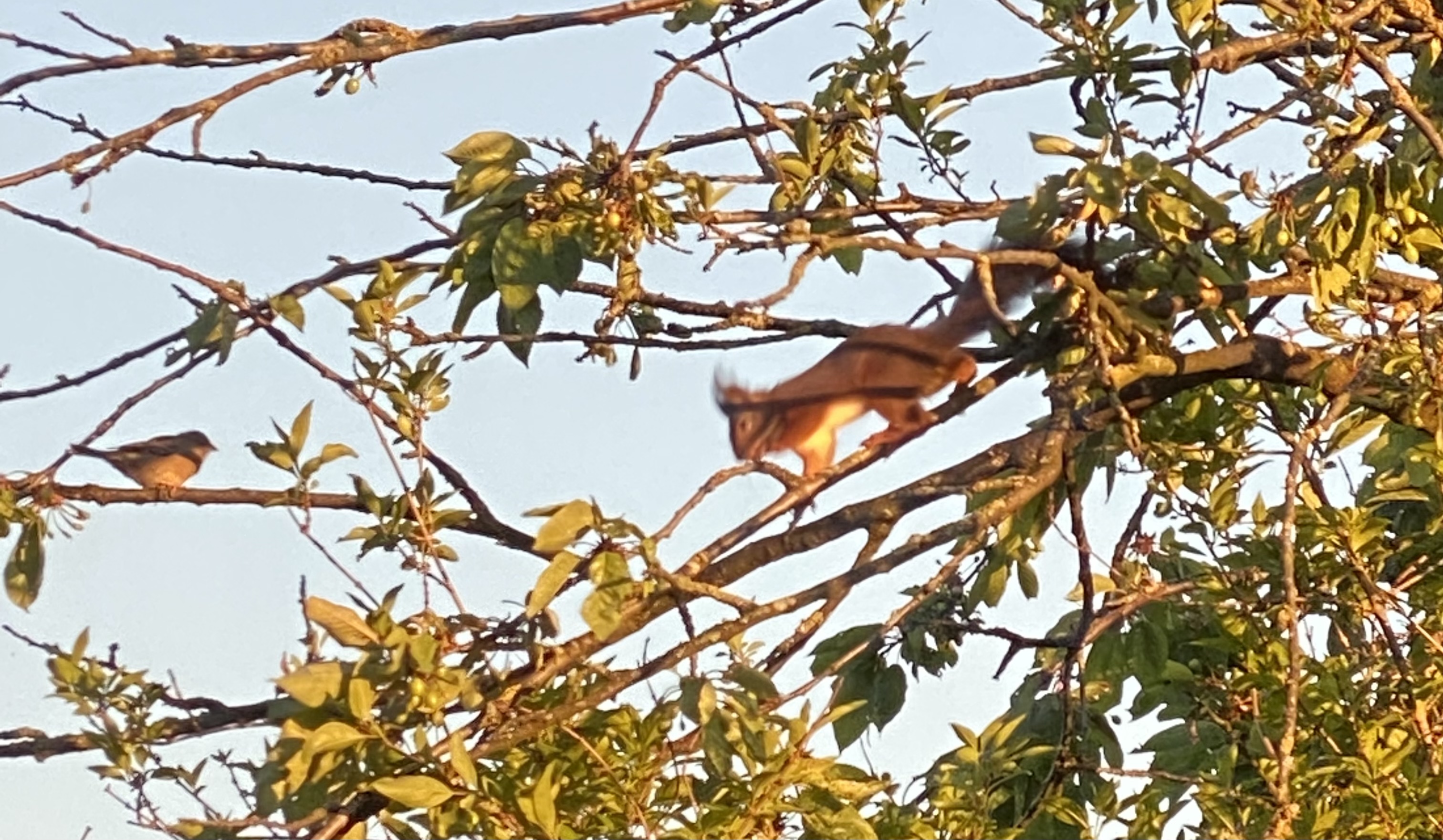 Als die Spatzen noch Junge im Nest hatten und das Eichhörnchen im Baum in unmittelbarer Nähe war, haben beide Elternteile das Eichhörnchen angegriffen. Wir waren ganz überrascht, wie Mutig. Das Eichhörnchen hat sich daraufhin getrollt und ist weiter gesprungen. Obwohl das Eichhörnchen in Nesträuber ist, freuen wir uns, wenn es durch den Garten springt.