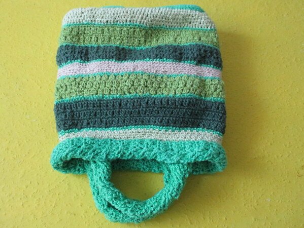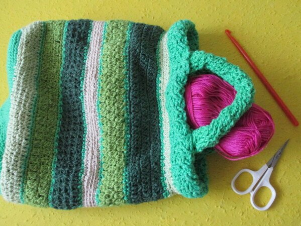 Eine Tasche mit verschiedenen Muster in verschiedenen Farben gehäkelt.