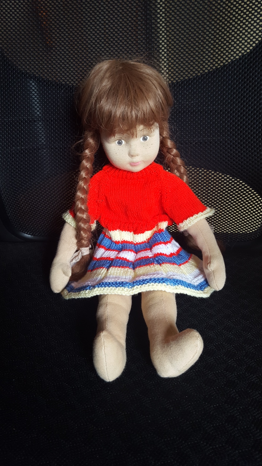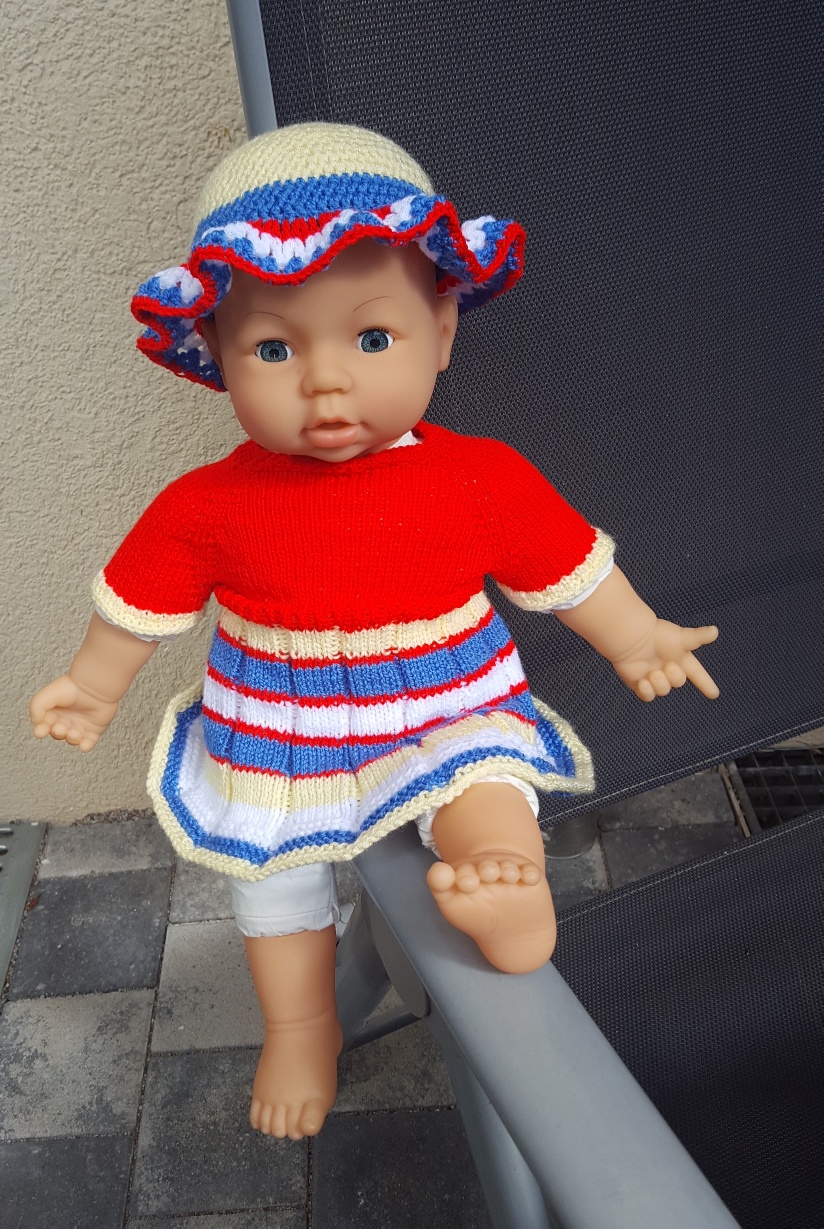 Marion, das Puppenkleidchen steht Maxima super, und mit dem passenden Hut dazu ist das Outfit komplett. Ziehst du deine Puppe eigentlich regelmäßig um, oder behält sie die Sachen immer eine Weile an? Und sie bekommt dann erst wieder etwas anderes, wenn du ein neues Kleid gestrickt hast?
