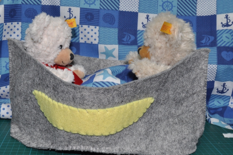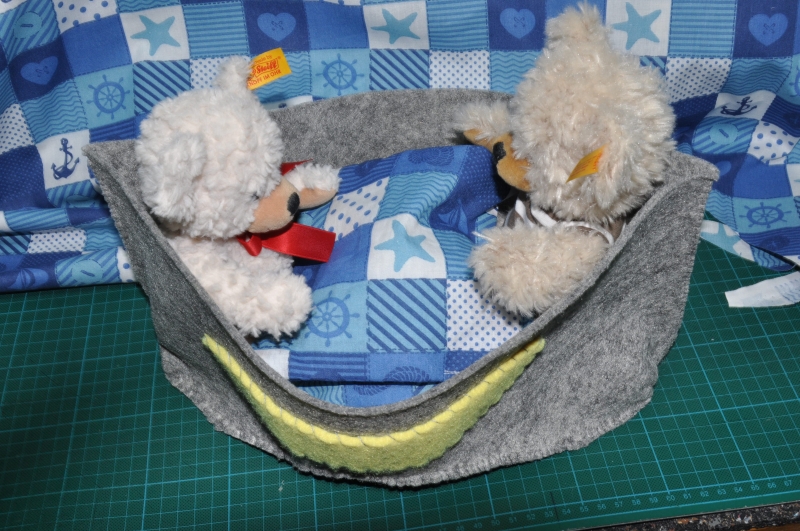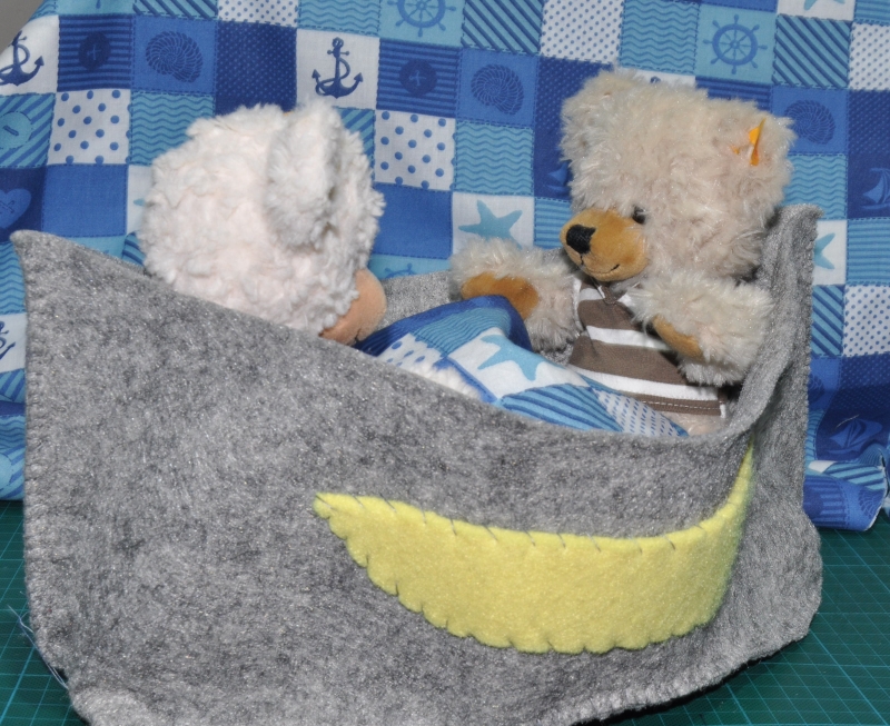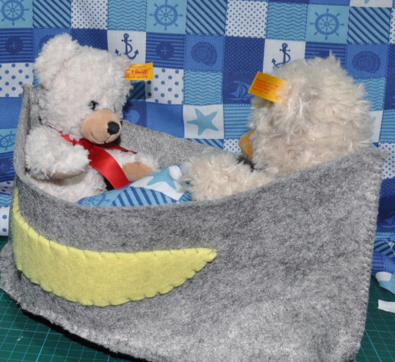hab vor ca 2 Jahren von meinem Mann diese zwei süßen Steiffteddys mal geschenkt bekommen, seit einiger Zeit trug ich mich schon mit dem gedanken das die zwei was eigenes brauchen, die ganze Zeit lagen oder saßens bei mir oben am Kopfteil im Bett. :-) Nun habens ihren eigenen Platzdas *Boot* hab ich von Hand genäht, auch selber entworfen