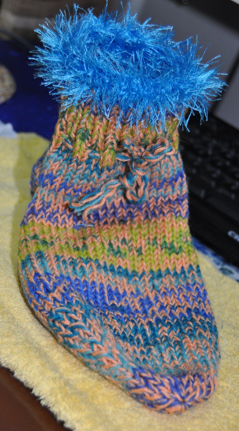 aus Restwolle hab ich ein paar haussocken gestrickt und auf die Sohle so Stoppergel aufgebracht, so könnens ned ausrutschen wenns die Socken anhaben