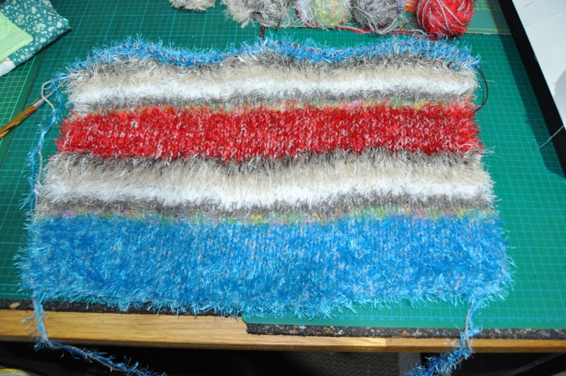 Nun ist es fertig, aber es gefällt mir gar nicht. Es ist 50 x 50 cm groß; sollte nur 35 x 35 cm werden. Ich kuck es mir am Wochenende an und wenn es mich nervt, wird es wieder ausgerippelt.