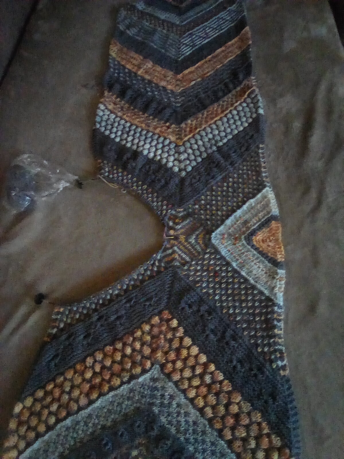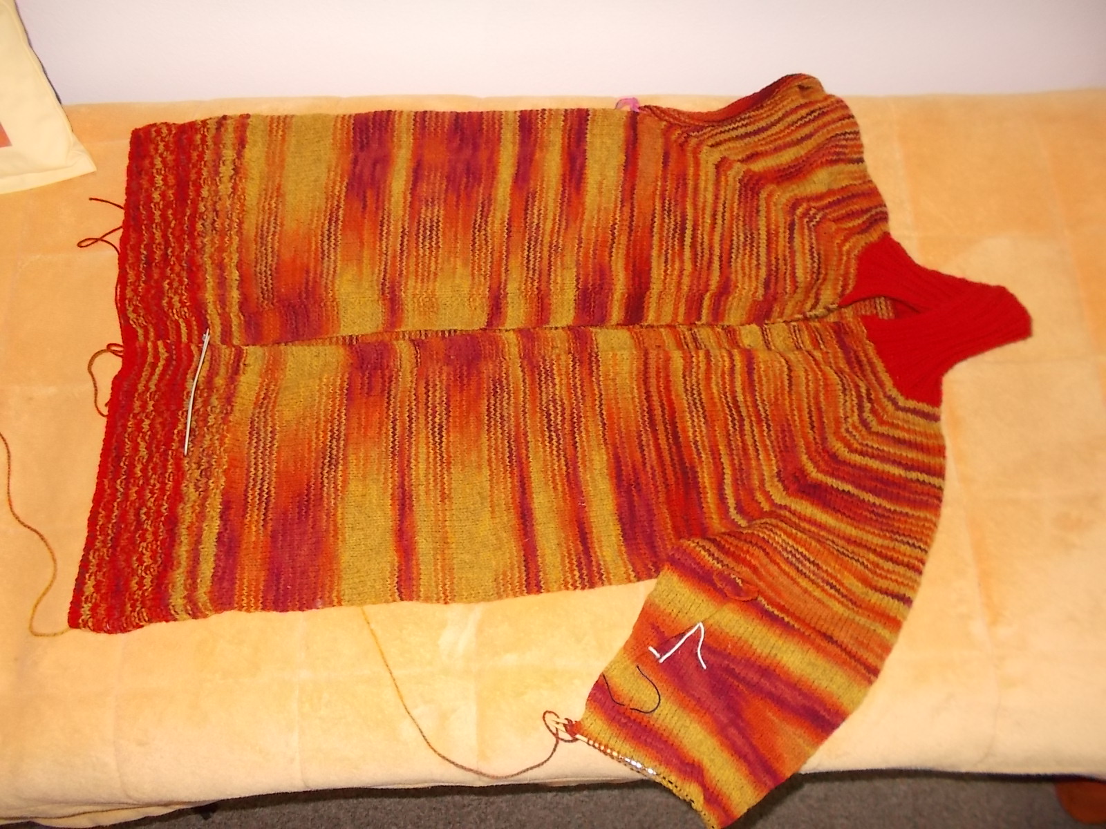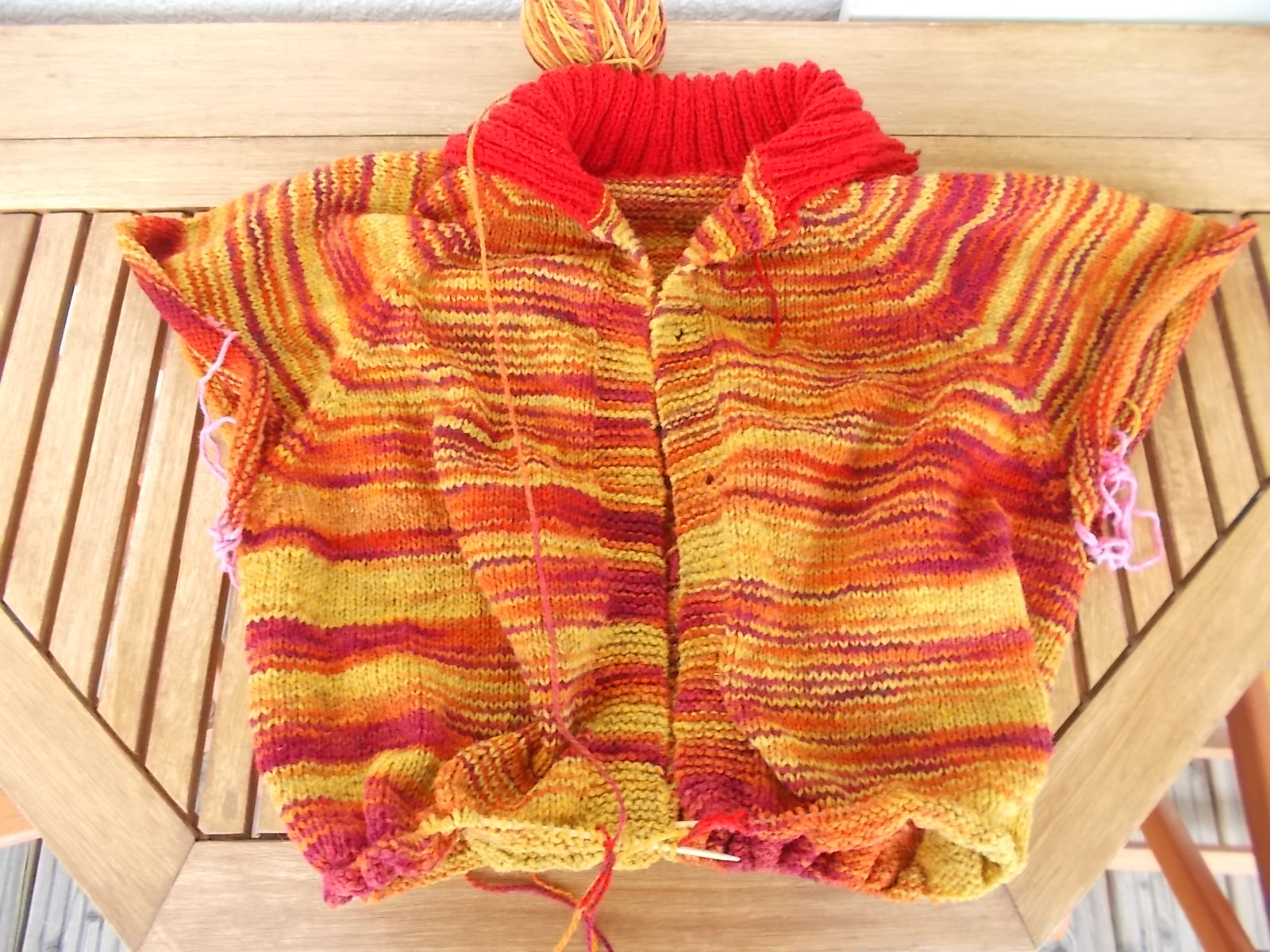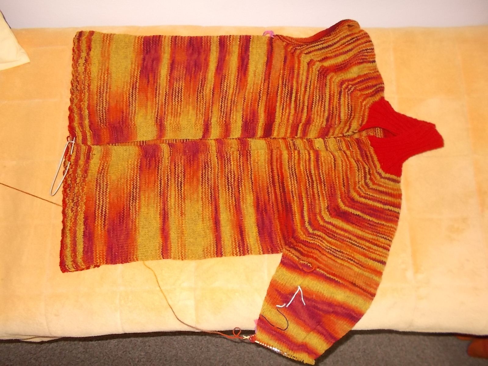Jetzt arbeite ich erstmal die Aufträge von der Familie ab. Die Strickjacke für meinen Sohn wächst ständig. So sieht sie jetzt nach einer guten Woche aus.