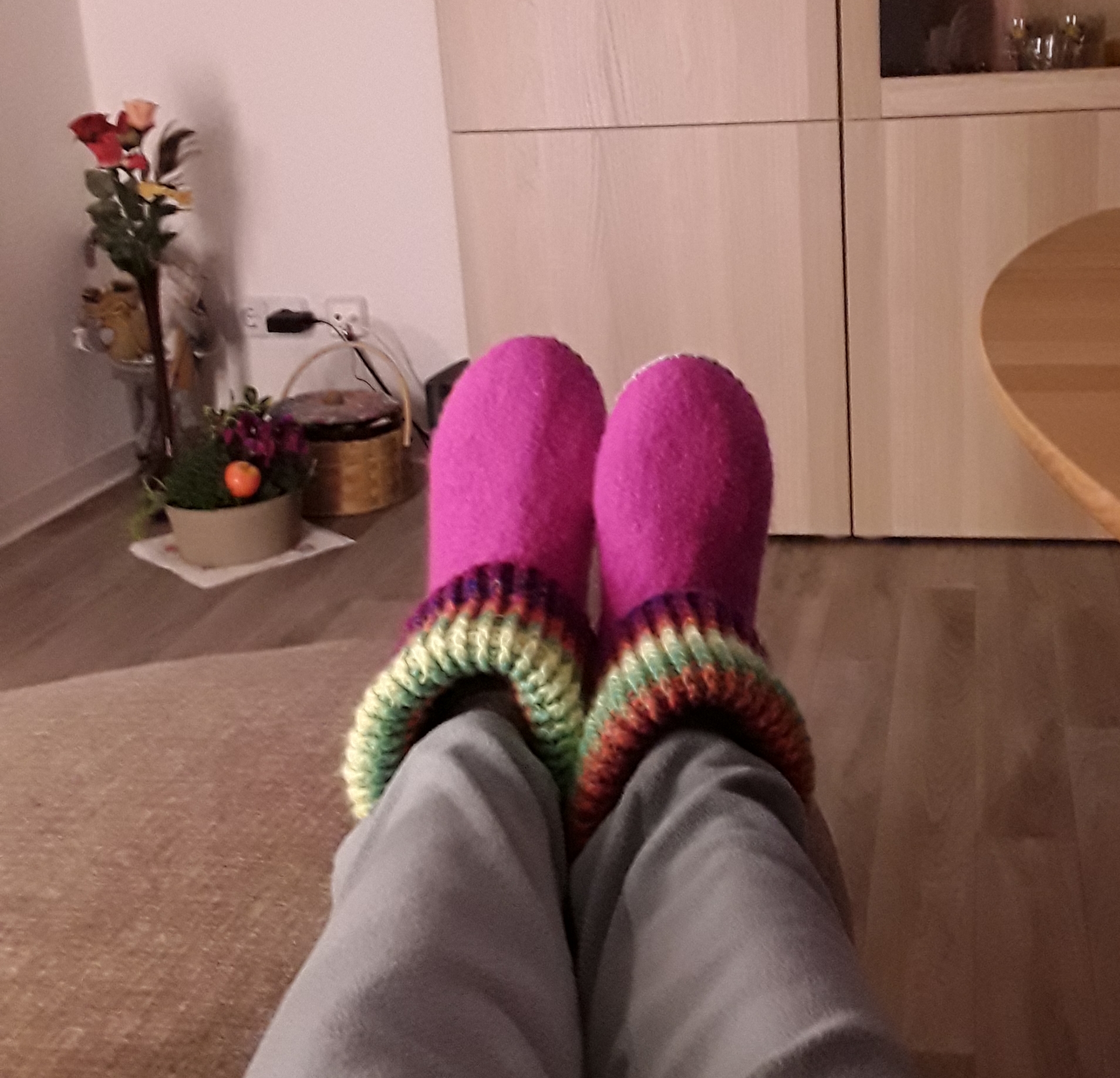Ich kam nun auch endlich in den Genuss von Ina's Filzies. Die sind so was von kuschelig, keine kalten Fuesse mehr, und in meiner Lieblingsfarbe. Danke schoen liebe Ina. Die haben alle bewundert.