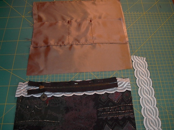 Bild1 Ober und Futter stoff in passender Größe zuschneiden, und auf das Futter passend dann Innentaschen aufsteppen.