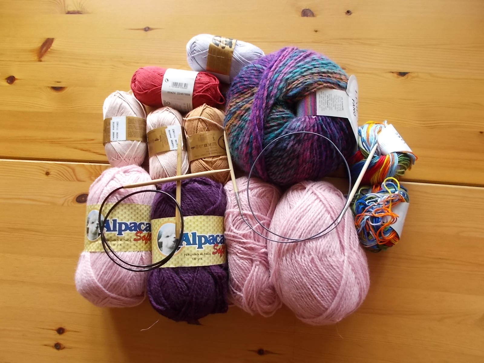 Ich kam ja aus dem Staunen gar nicht heraus. Bis auf eine paar Knäule dickerer Wolle, die von mir stammten, war für mich alles neu und sehr sehr spannend. Ich habe heute nach dem Frühstück ganz gemütlich alles genau untersucht, angeguckt, angefasst, an meinen zarte Halshaut gehalten und in meinem Gehirn entwickelten sich sofort Ideen zu diesem oder jenem Garn.