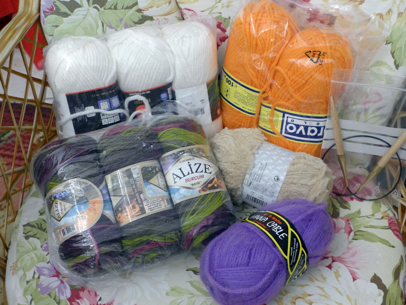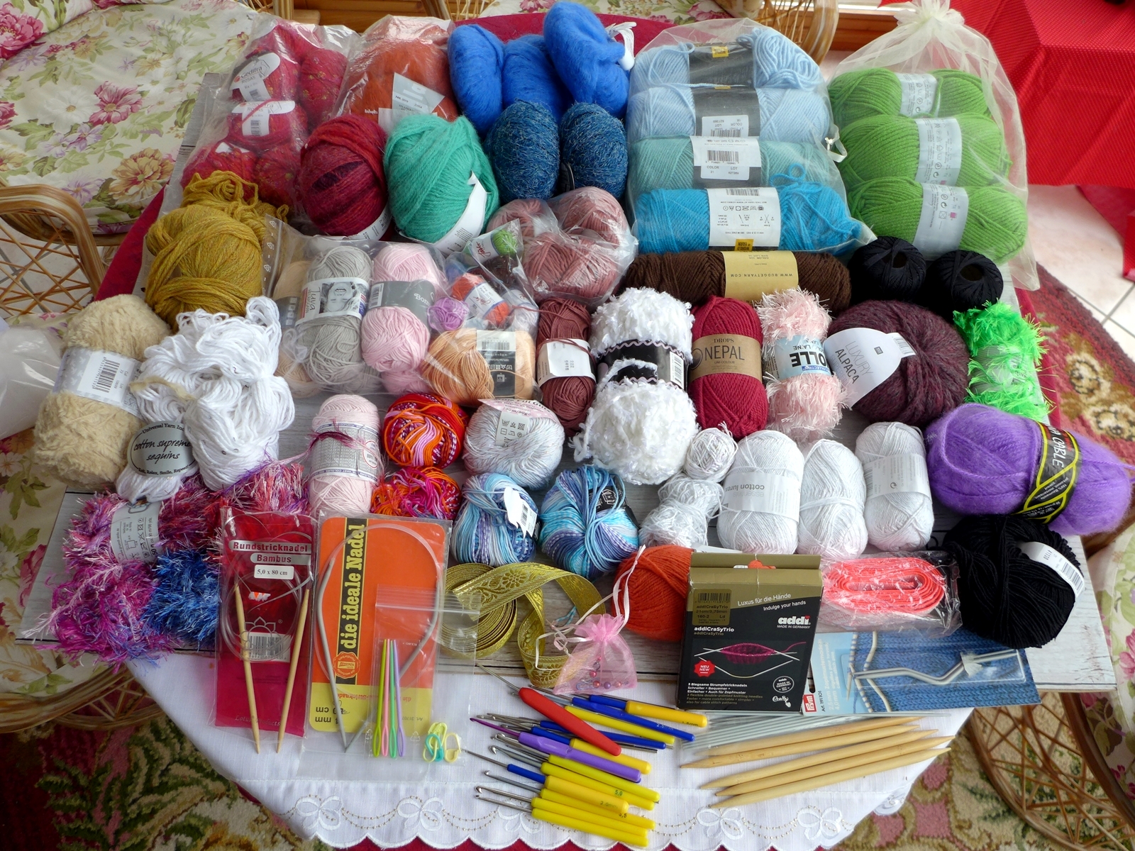 Es gab auch sehr viele Häkelnadeln. Damit bin ich nun sehr gut versorgt. Damit Ihr sehen könnt, was ich bekommen habe, gibt es ein großes Gruppenfoto. Es passte kaum auf meinen Tisch. Vielleicht erkennt Ihr Eure Garne ja wieder? (Rechtsklick aufs Bild und in einem neuen Fenster öffnen, dann könnt Ihr alles besser sehen)